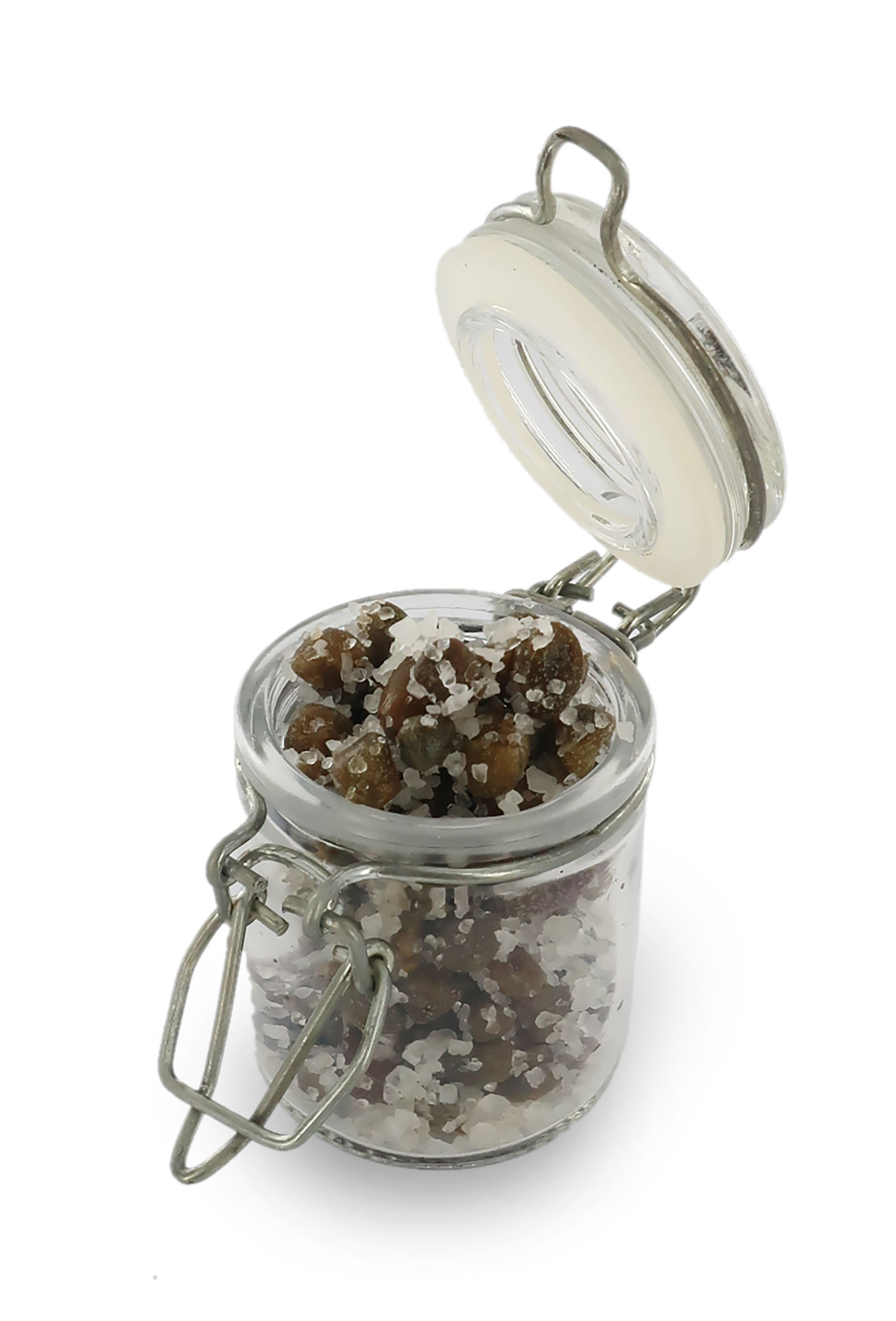 Capperi di Sicilia selezionati, calibro piccolo, conservati in sale marino. I capperi piccoli sono indicati per guarnire piatti di pesce e di carne rossa o bianca. Sciacquarli dal sale prima dell’uso.