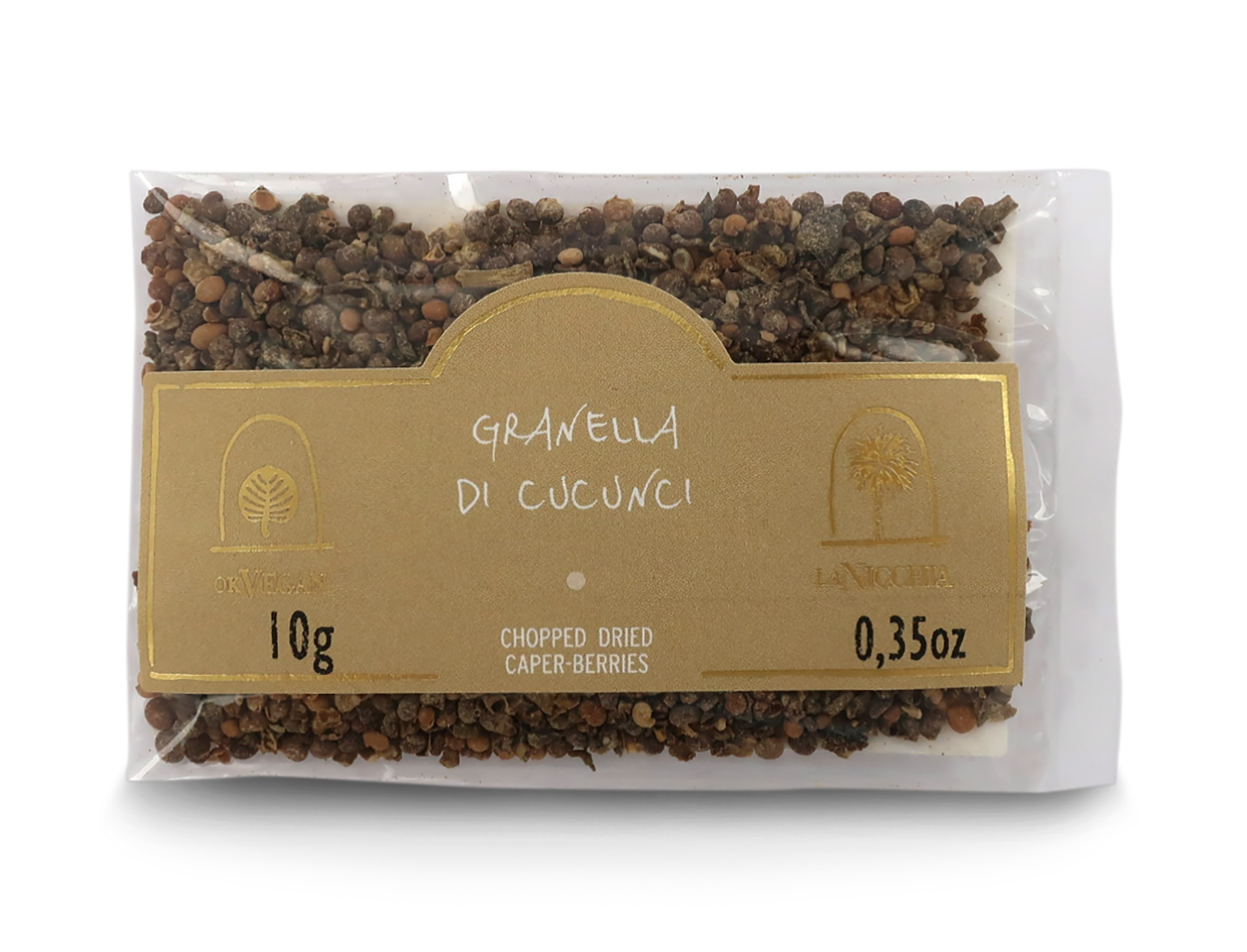 Granella di cucunci (frutto del cappero di Pantelleria). Cucunci di grosse dimensioni, attentamente selezionati, vengono dissalati, essiccati, sbriciolati e setacciati. Grazie ai semi della pianta e parte della polpa del frutto, si ottiene una polvere molto grossolana, che aggiunta alle pietanze dona loro una nota aromatica e croccante. La granella di cucunci è ideale per capesante, crudità di pesce, insalate, risotti e piatti di pasta.