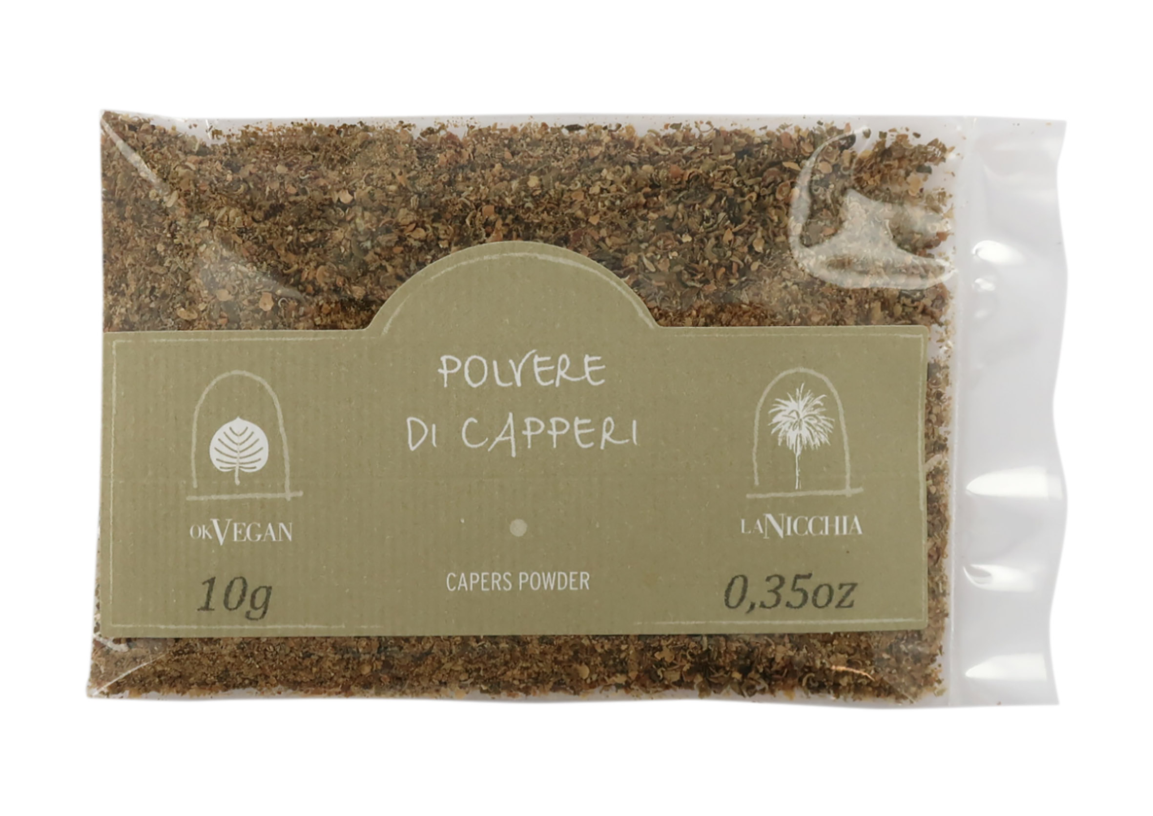 Polvere di cappero extra-fine. Come vuole la tradizione pantesca, il cappero viene consumato sulle tavole dell'isola siciliana di Pantelleria sotto varie forme. La Nicchia, capperificio storico con un'attività di oltre 70 anni, raccoglie e lavora con sapienza i capperi di grosso calibro profumati, che vengono dissalati, essiccati in parte al sole e in parte in disidratatore, per poi essere frullati e setacciati. Si ottiene una fine polvere aromatica da usare come insaporitore in una vasta gamma di preparazioni, sia calde che fredde (piatti di pesce, carne, insalate, zuppe e risotti).