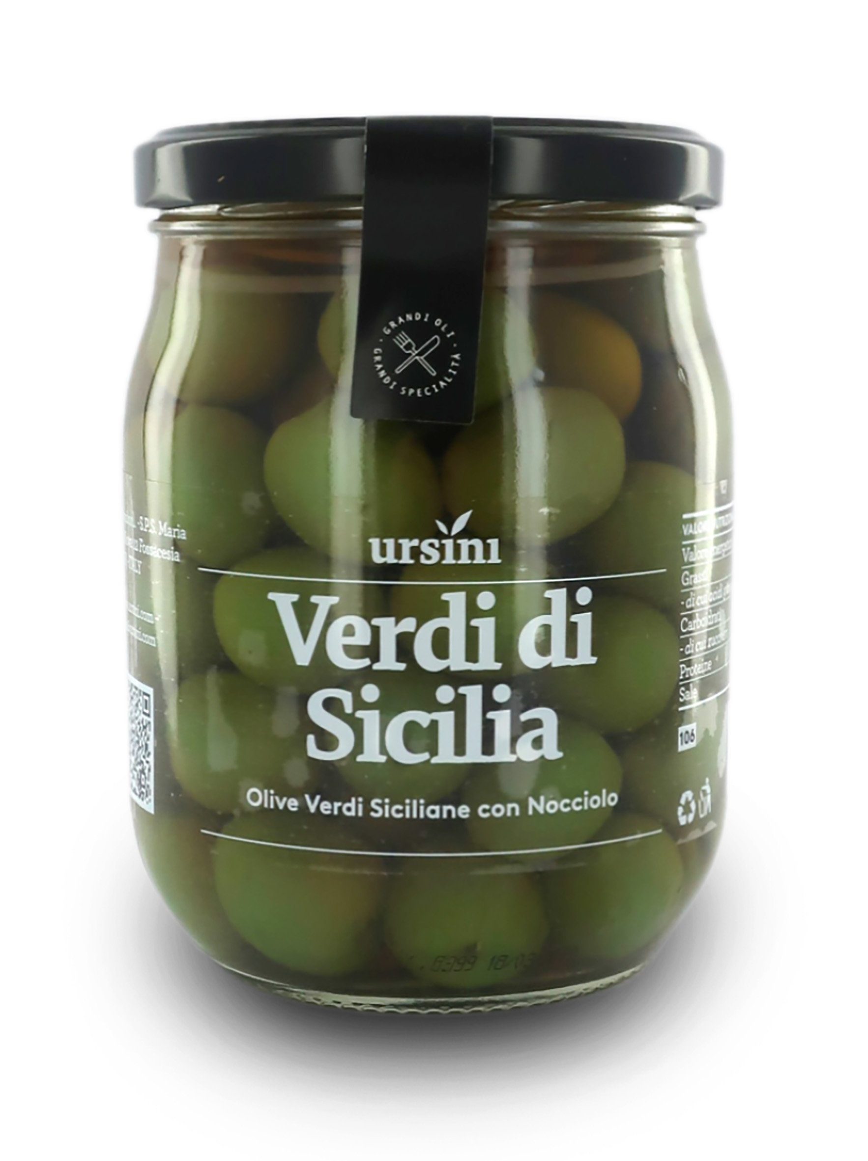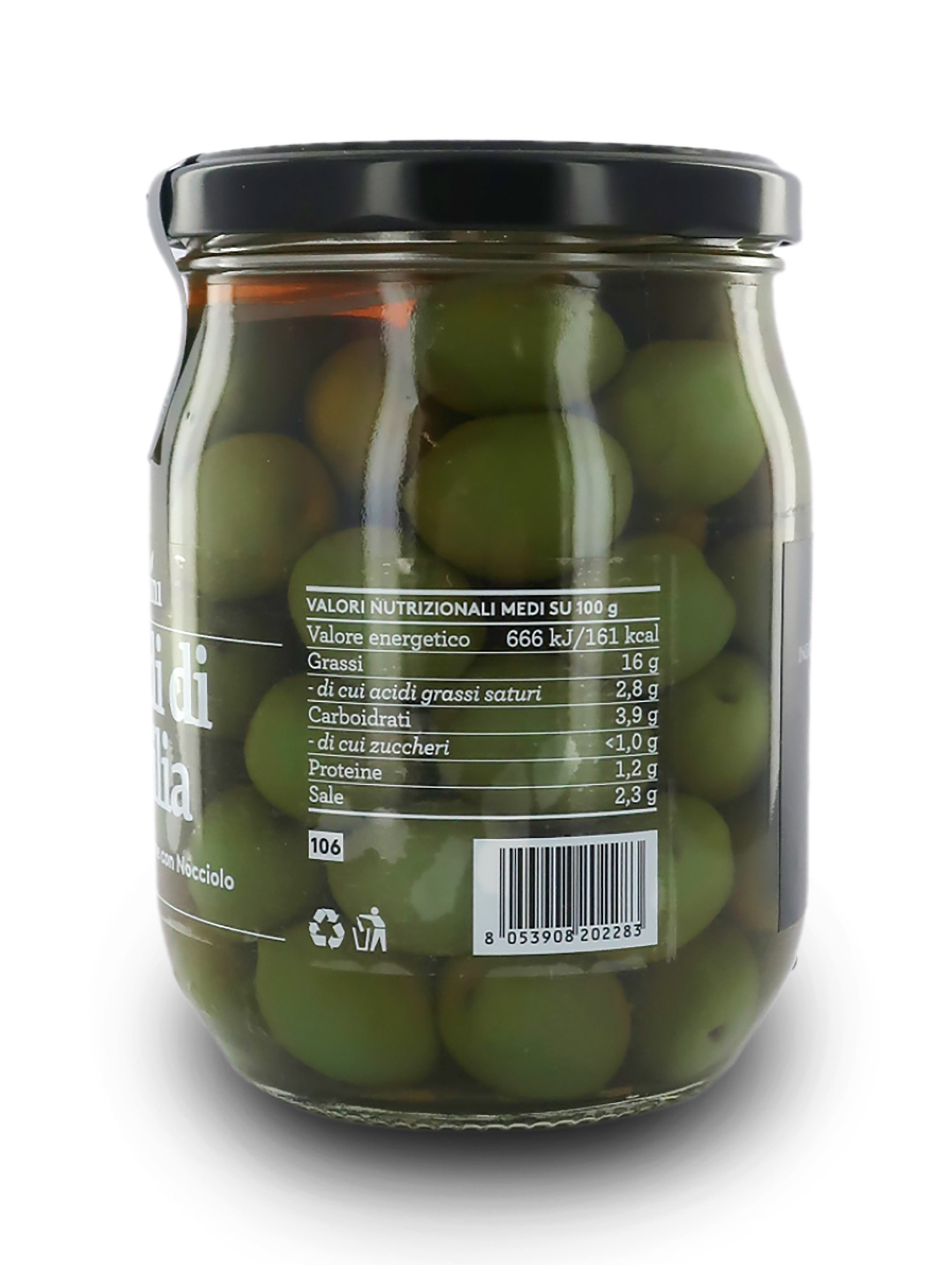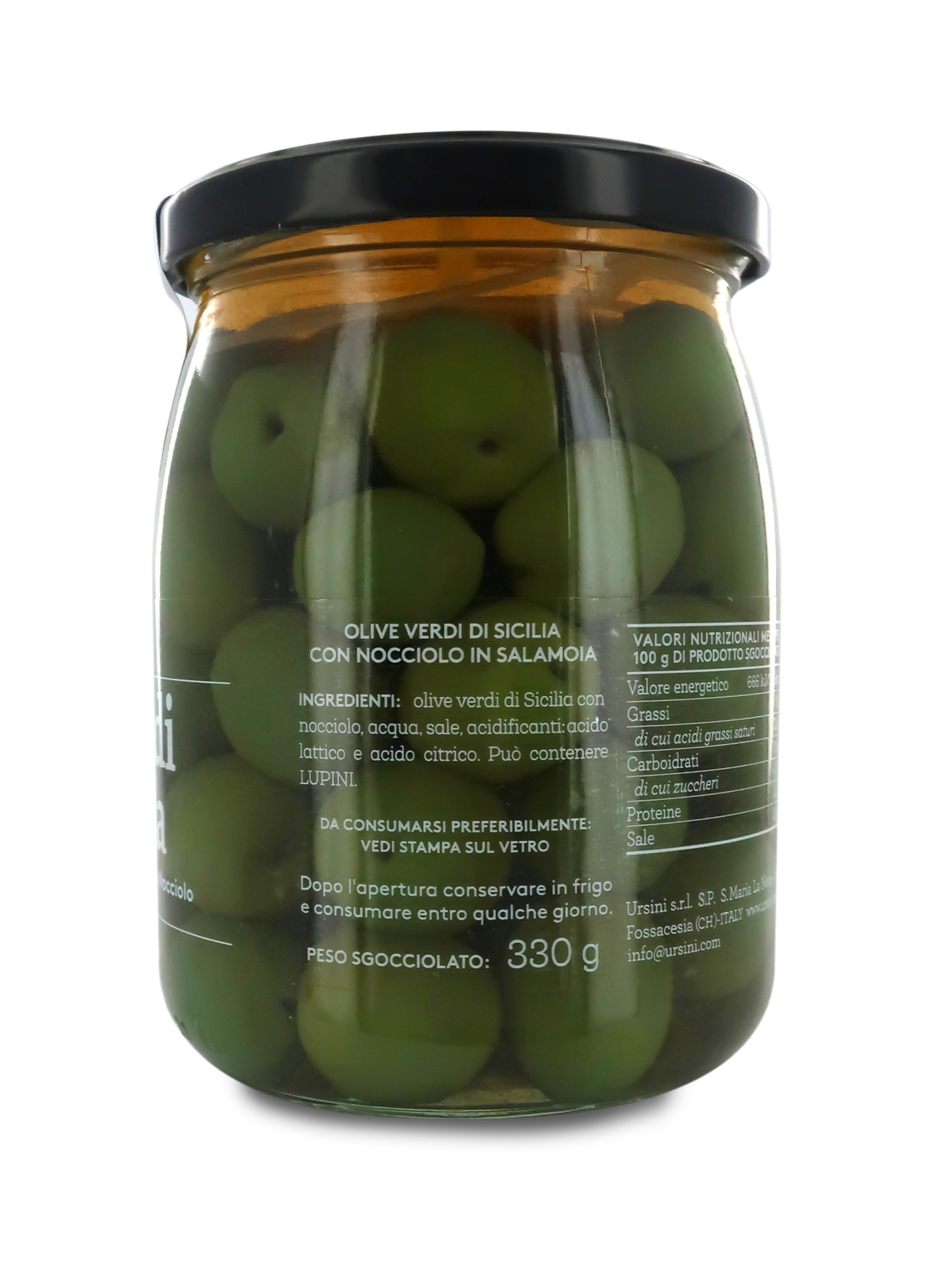 Ingredienti: olive verdi di Sicilia con nocciolo, acqua, sale, acidificanti: acido lattico e acido citrico. Può contenere LUPINI.