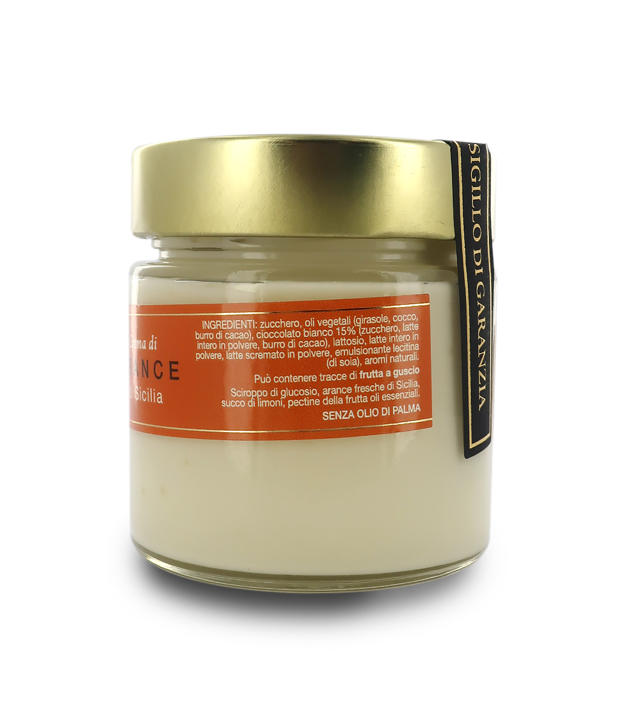 Dalla consistenza vellutata, la crema all'arancia siciliana è adatta per una pausa caffè sfiziosa. Ottima per rendere una fetta di torta o di colomba ancora più golosa, è realizzata con una base di cioccolato bianco e una purea di arance fresche, uno dei prodotti vanto della terra di Sicilia.