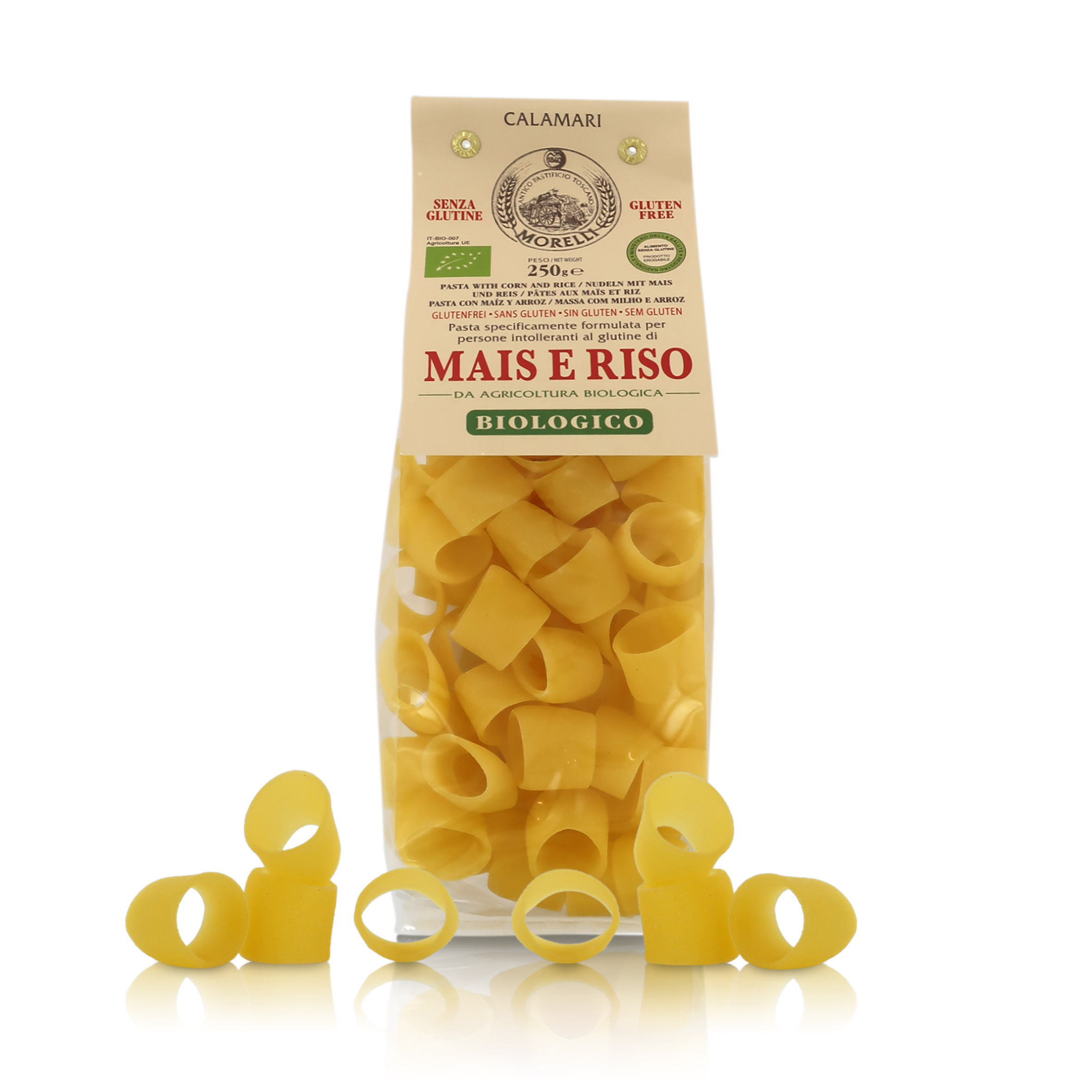 Pasta formato "calamari" (una sorta di pacchero corto) al mais e riso bio, linea "La pasta di mais e riso", 8 confezioni da 250 grammi. Le paste di questa linea, realizzate con mais e riso, sono particolarmente indicate per soggetti intolleranti al glutine.