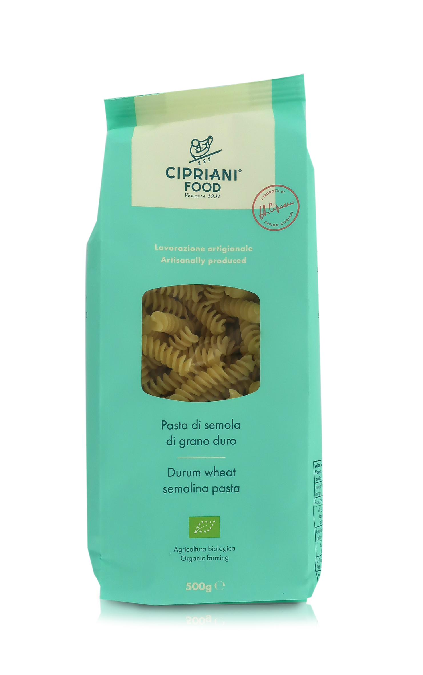 Formato iconico, tipico della pasta italiana. Con la loro splendida forma a spirale, i fusilli Cipriani raccolgono qualsiasi condimento. Cipriani suggerisce di assaggiarli leggermente indietro di cottura, accorciando di un solo minuto il tempo di cottura suggerito in confezione. I fusilli Cipriani tengono bene la cottura e grazie alla trafilatura al bronzo, la superficie risulta porosa al punto giusto per poter trattenere il condimento senza farlo scivolare. Ottimi anche per la realizzazione di insalate di pasta fresche per l'estate.