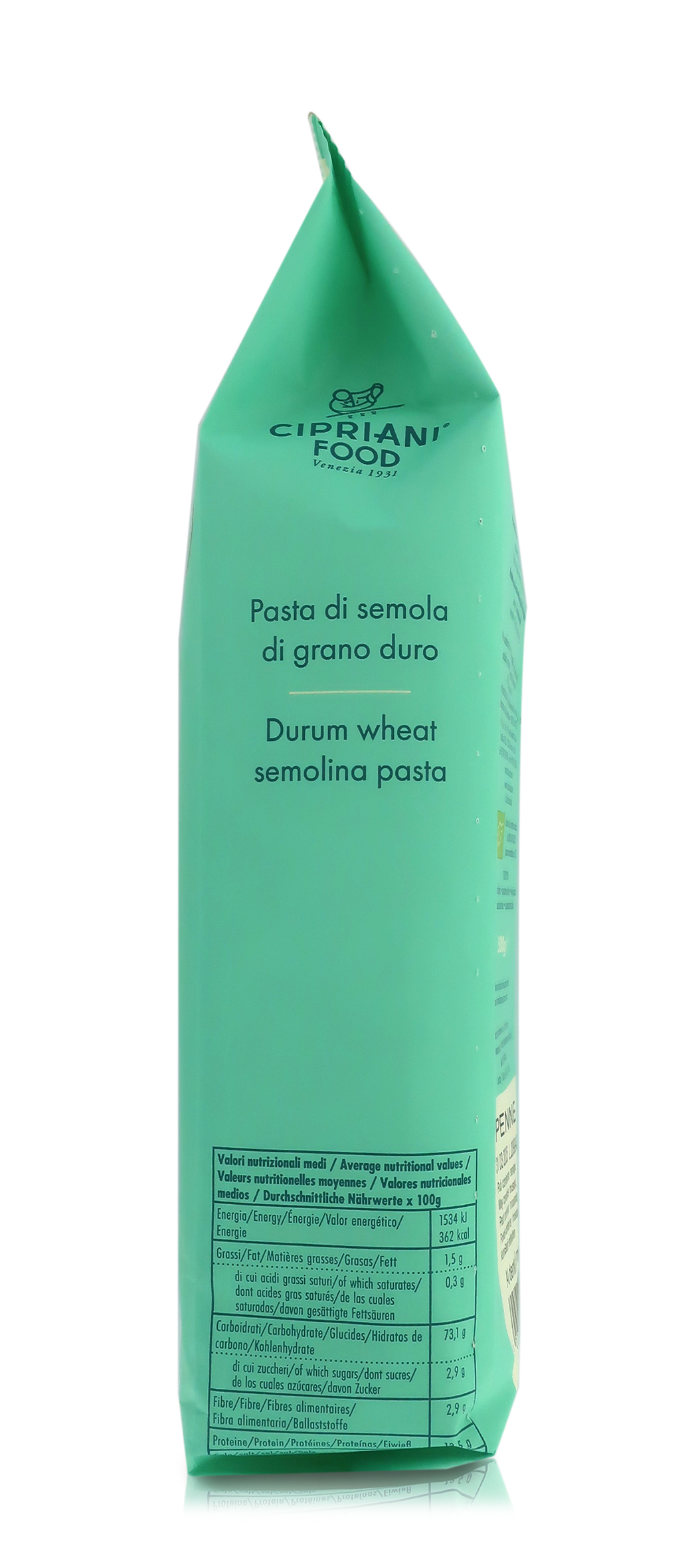 La pasta di grano duro Cipriani viene prodotta con semola biologica 100% italiana e la sua lavorazione è tale da preservare tutte le qualità nutrizionali; l’indice di proteine molto elevato dona alla pasta un’alta elasticità ed una buona tenuta in cottura. Inoltre, grazie all’utilizzo della trafila di bronzo si ottiene un prodotto dalla texture ruvida che favorisce l’assorbimento del condimento.