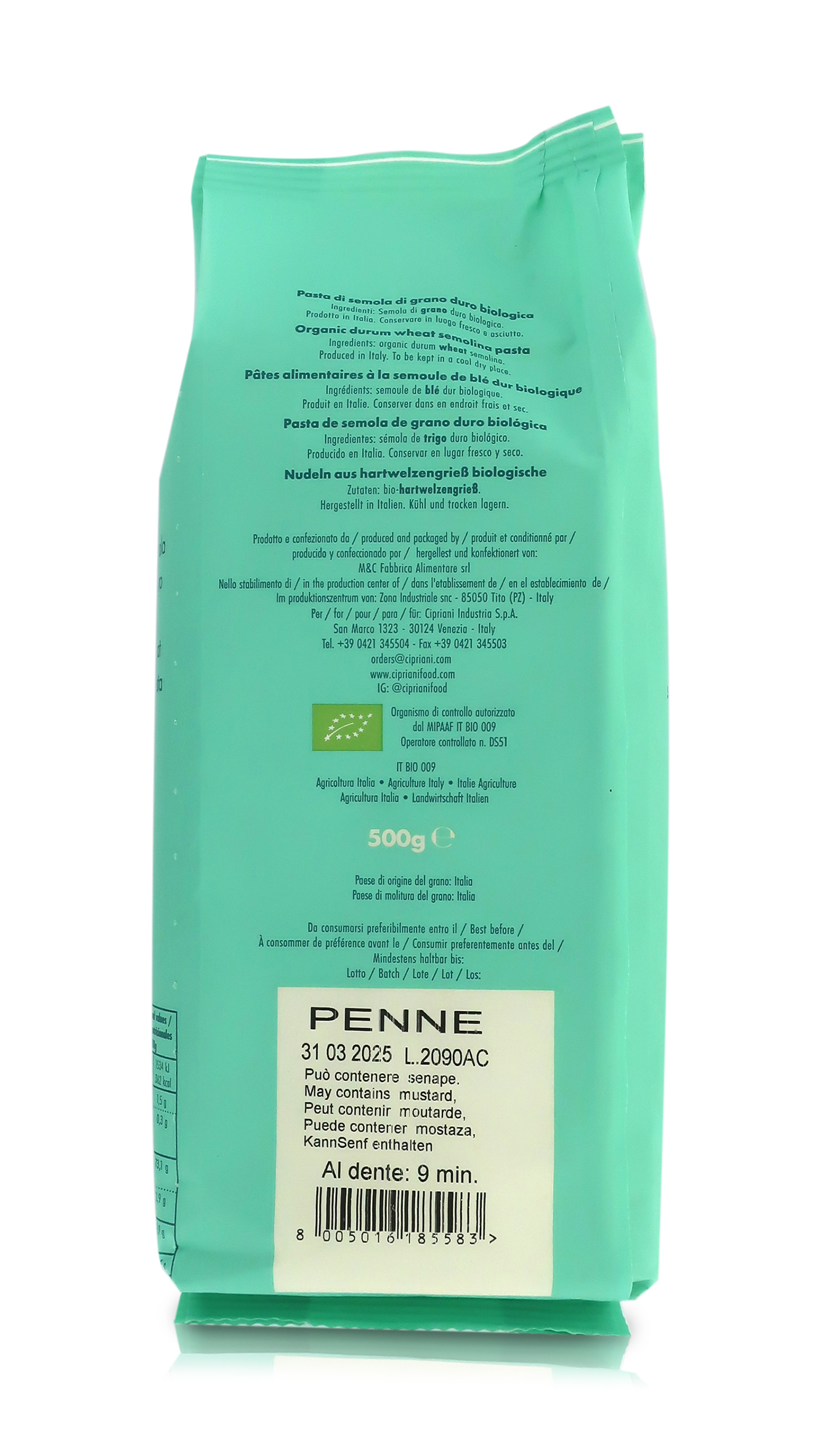 Cipriani Penne Bio, Pasta di Semola di Grano Duro da Agricoltura Biologica Italia, Penne Biologiche Italiane Trafilate al Bronzo e Ottenute con Lavorazione Artigianale, 12 x 500g