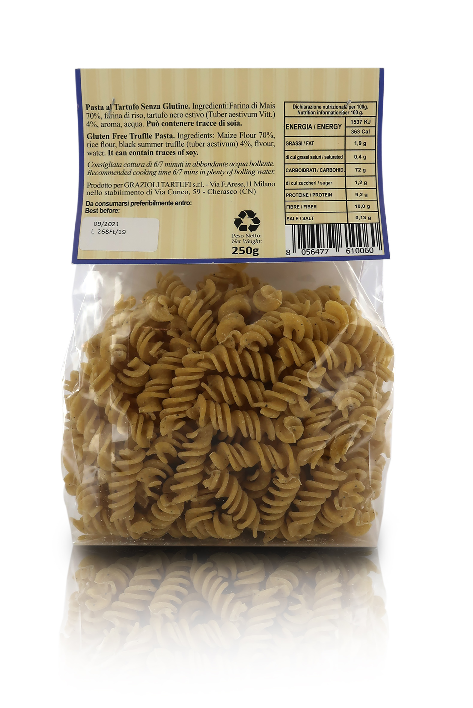 Pasta corta (fusilli) aromatizzata al tartufo, senza glutine (confezione da 250g). Realizzata artigianalmente mediante trafilatura al bronzo, contiene con farina di mais e di riso e piccoli pezzettini di tartufo nero estivo.