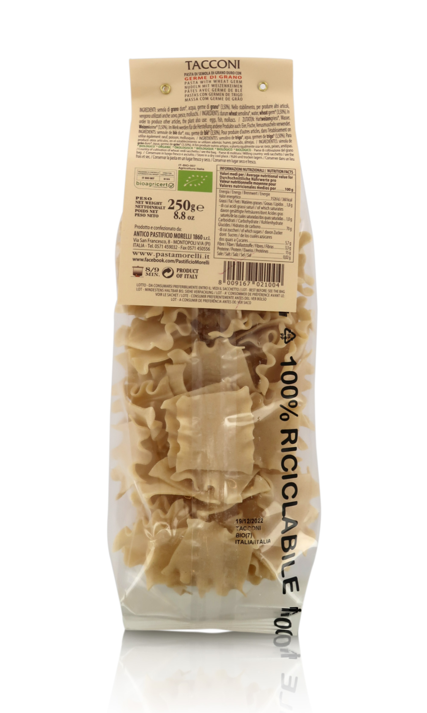 Pasta formato "Tacconi" al germe di grano bio; linea "I Cereali", 8 pacchetti da 250 grammi.