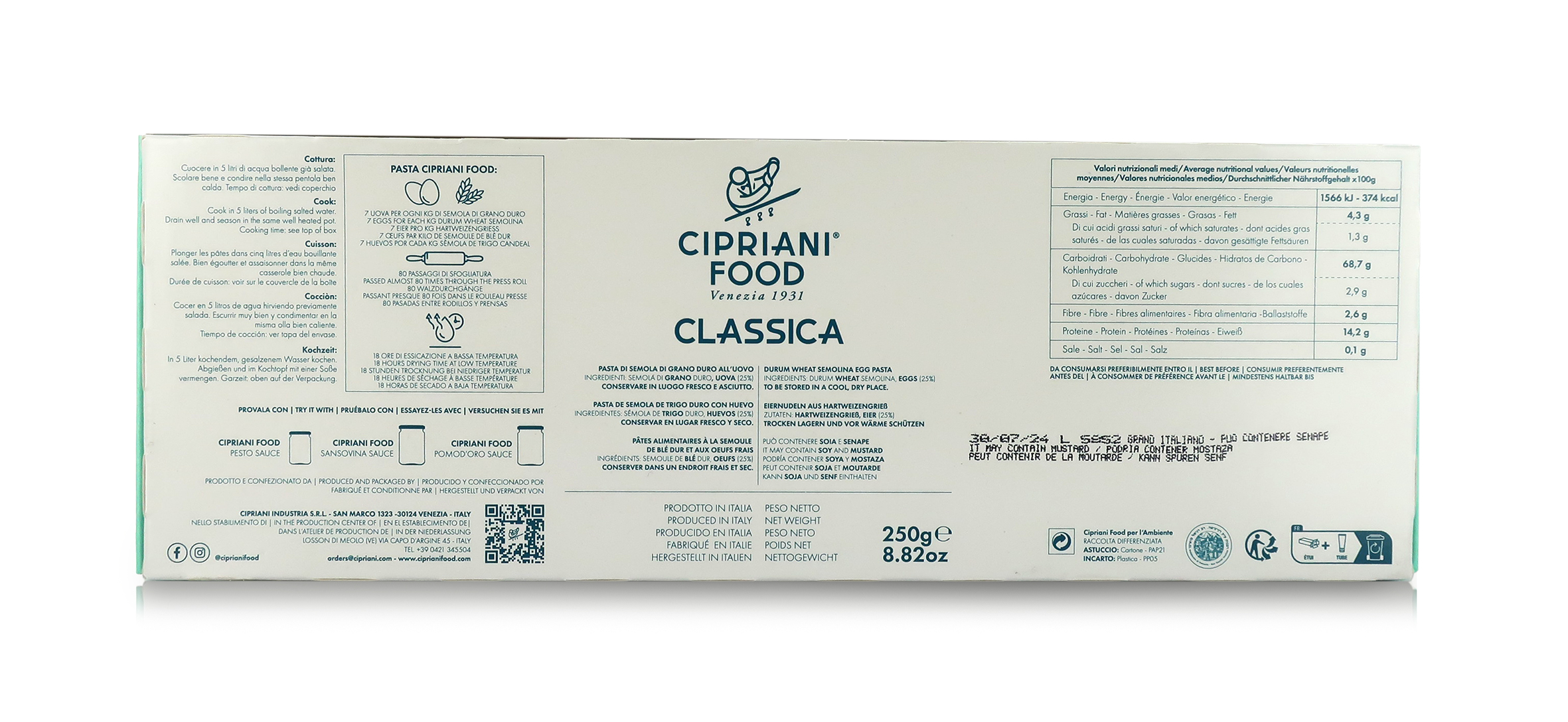 Pasta all'uovo Cipriani: il segreto è ovviamente nella sfoglia, elemento comune a tutti i formati di pasta gourmet Cipriani. 1 kg di semola di grano duro della migliore qualità incontrano 7 uova fresche lavorate con precisione, energia e pazienza. Oltre 80 passaggi e piegature grazie a una macchina esclusiva ideata da Arrigo Cipriani. Dopo 14 ore di essiccazione a bassa temperatura, si ottiene una sfoglia sottile e vellutata al palato, che in pochi minuti di cottura cresce generosa e risulta "al dente". Cipriani Food racchiude una selezione di prodotti che si distingue per gusto e stile. Ottima materia prima, cura nella preparazione e un packaging dal design moderno ed elegante sono i tratti distintivi del brand Cipriani Food, espressione del Made in Italy d'eccellenza.