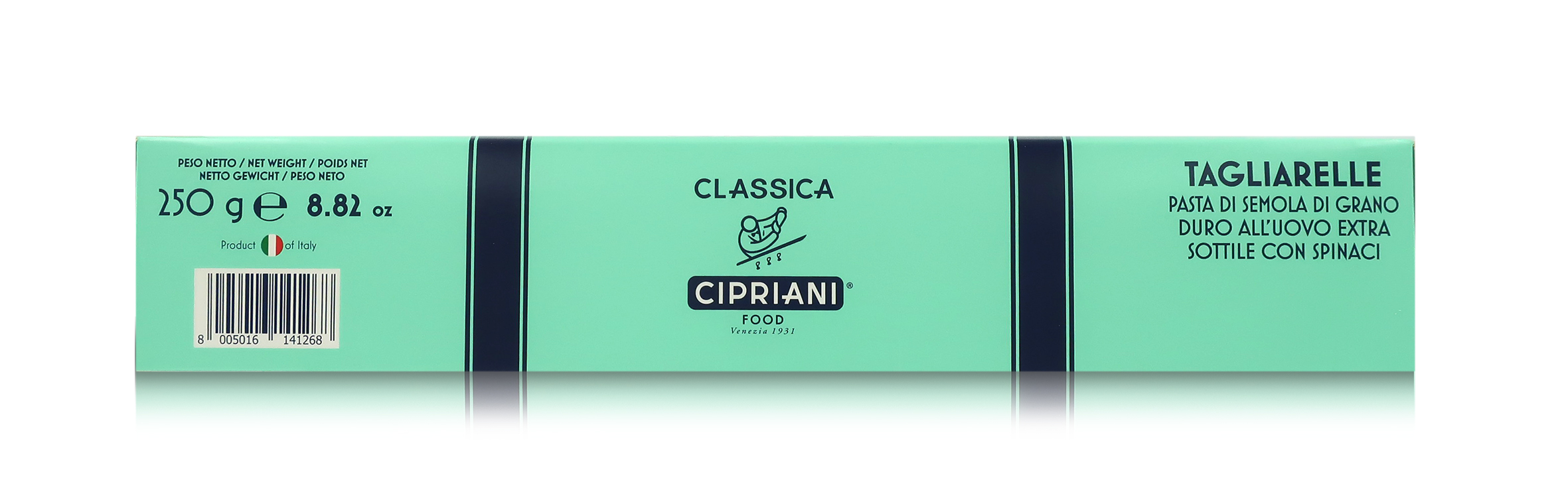 Pasta all'uovo Cipriani: il segreto è ovviamente nella sfoglia, elemento comune a tutti i formati di pasta gourmet Cipriani. 1 kg di semola di grano duro della migliore qualità incontrano 7 uova fresche lavorate con precisione, energia e pazienza. Oltre 80 passaggi e piegature grazie a una macchina esclusiva ideata da Arrigo Cipriani. Dopo 14 ore di essiccazione a bassa temperatura, si ottiene una sfoglia sottile e vellutata al palato, che in pochi minuti di cottura cresce generosa e risulta "al dente". Cipriani Food racchiude una selezione di prodotti che si distingue per gusto e stile. Ottima materia prima, cura nella preparazione e un packaging dal design moderno ed elegante sono i tratti distintivi del brand Cipriani Food, espressione del Made in Italy d'eccellenza.