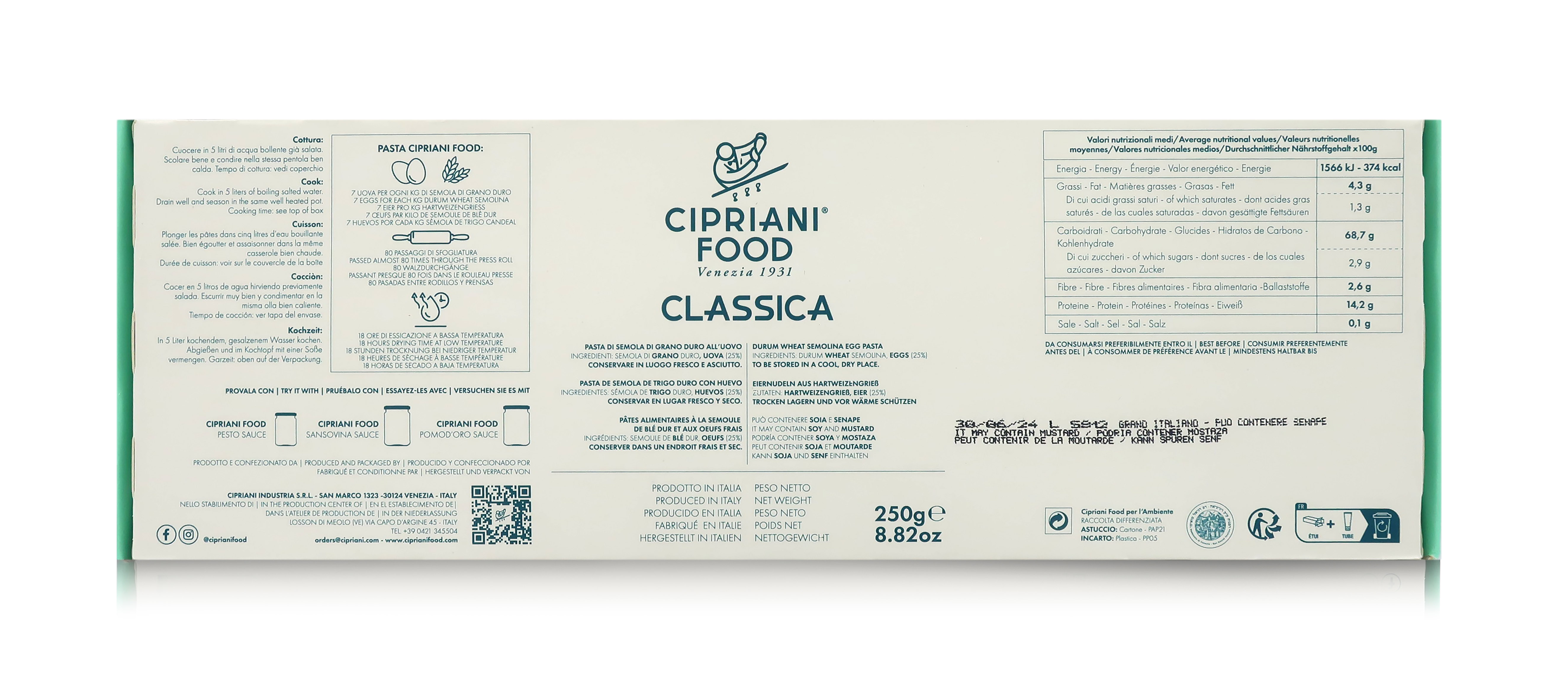 Pasta all'uovo Cipriani: il segreto è ovviamente nella sfoglia, elemento comune a tutti i formati di pasta gourmet Cipriani. 1 kg di semola di grano duro della migliore qualità incontrano 7 uova fresche lavorate con precisione, energia e pazienza. Oltre 80 passaggi e piegature grazie a una macchina esclusiva ideata da Arrigo Cipriani. Dopo 14 ore di essiccazione a bassa temperatura, si ottiene una sfoglia sottile e vellutata al palato, che in pochi minuti di cottura cresce generosa e risulta "al dente". Cipriani Food racchiude una selezione di prodotti che si distingue per gusto e stile. Ottima materia prima, cura nella preparazione e un packaging dal design moderno ed elegante sono i tratti distintivi del brand Cipriani Food, espressione del Made in Italy d'eccellenza.