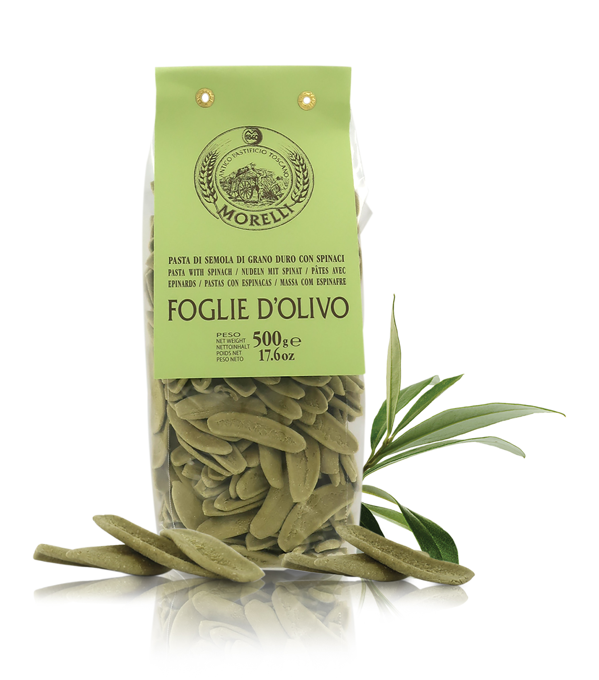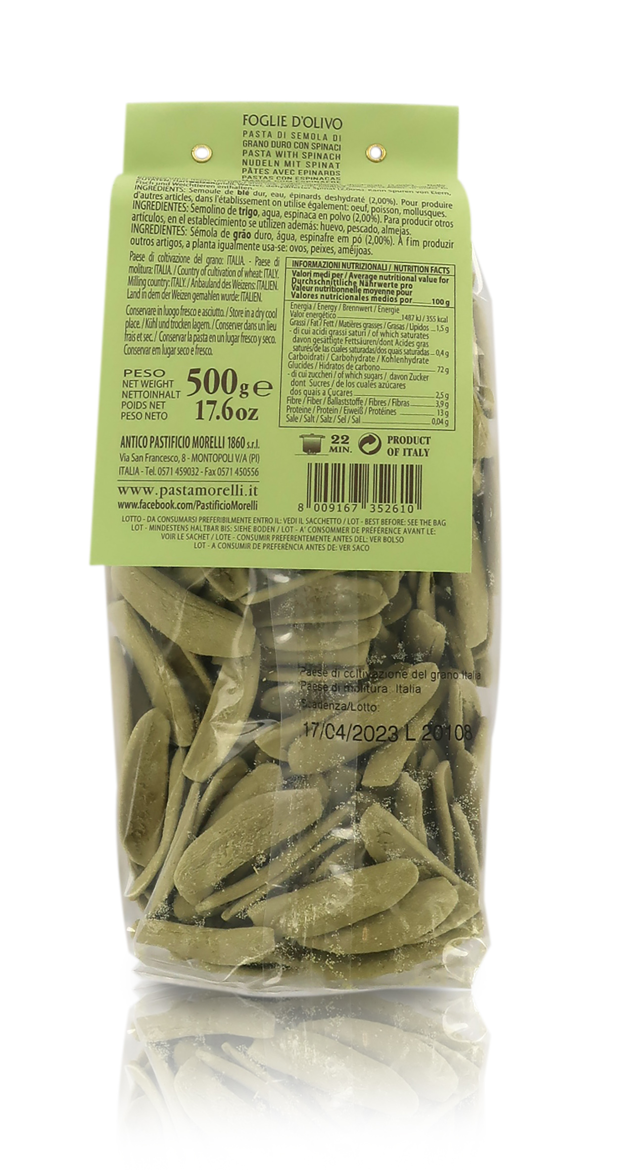 Pasta formato "foglie d'olivo" agli spinaci, pasta aromatizzata, 6 confezioni da 500 grammi.