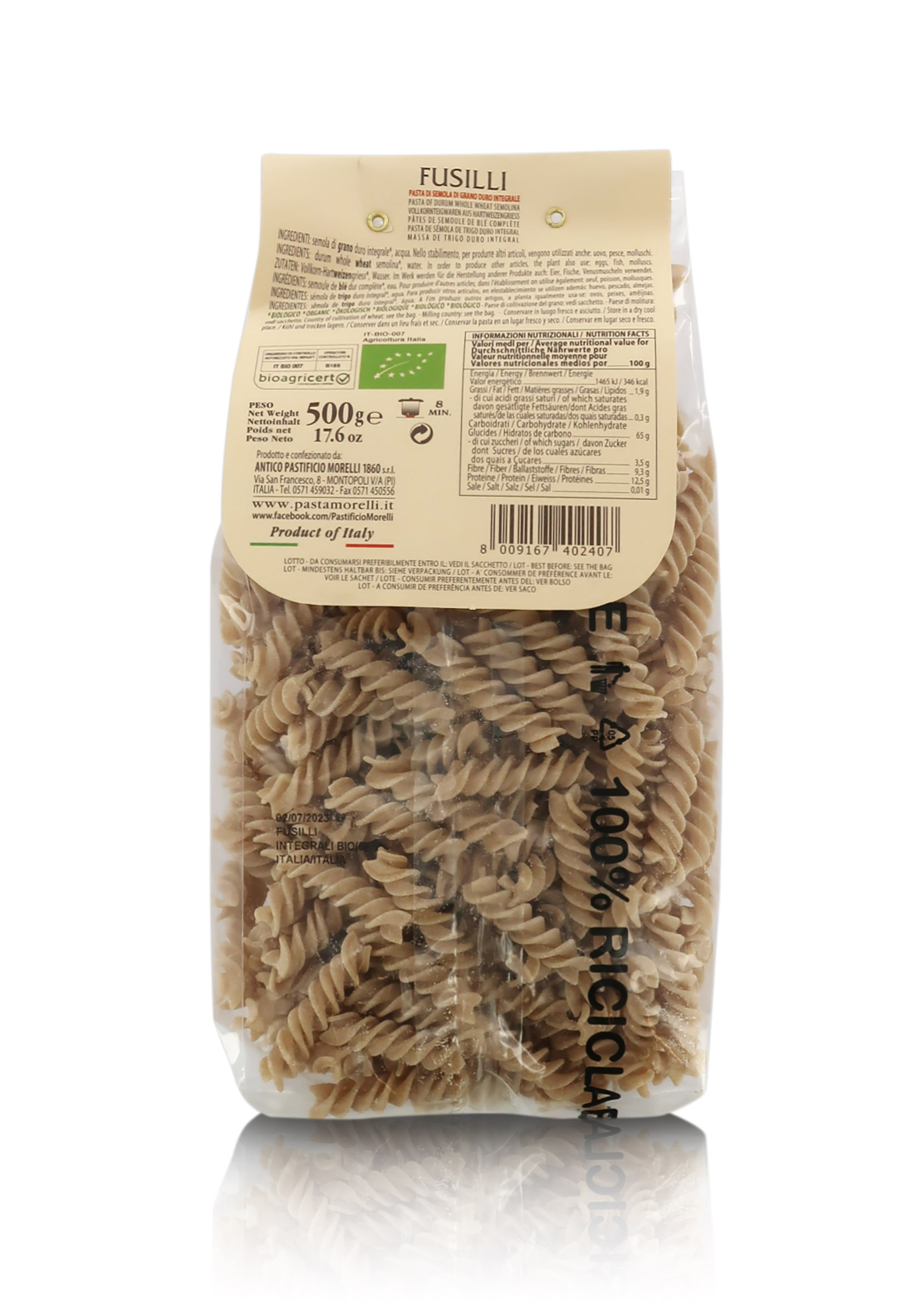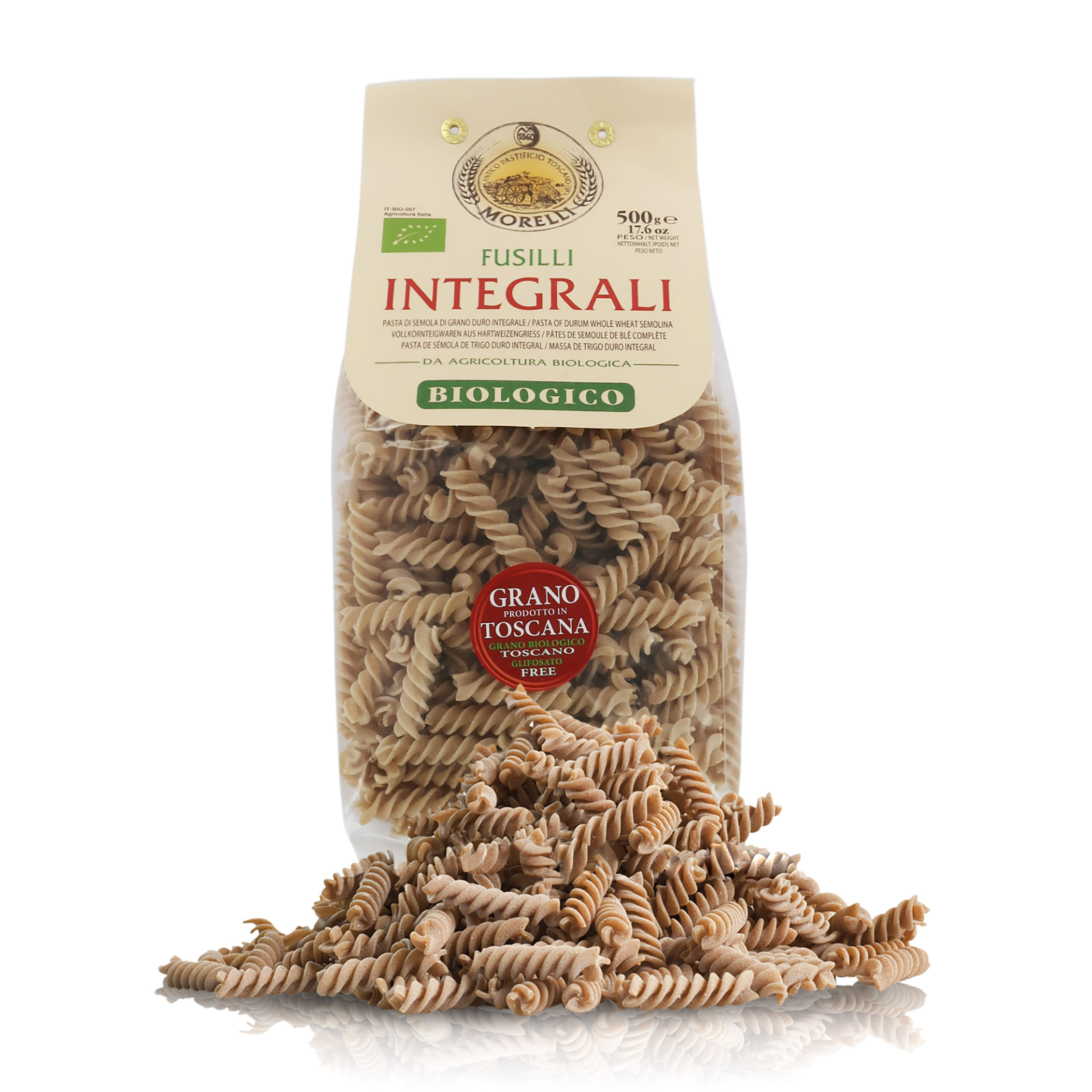 Fusilli integrali ottenuti da grano toscano senza glifosati, 6 confezioni da 500 grammi.