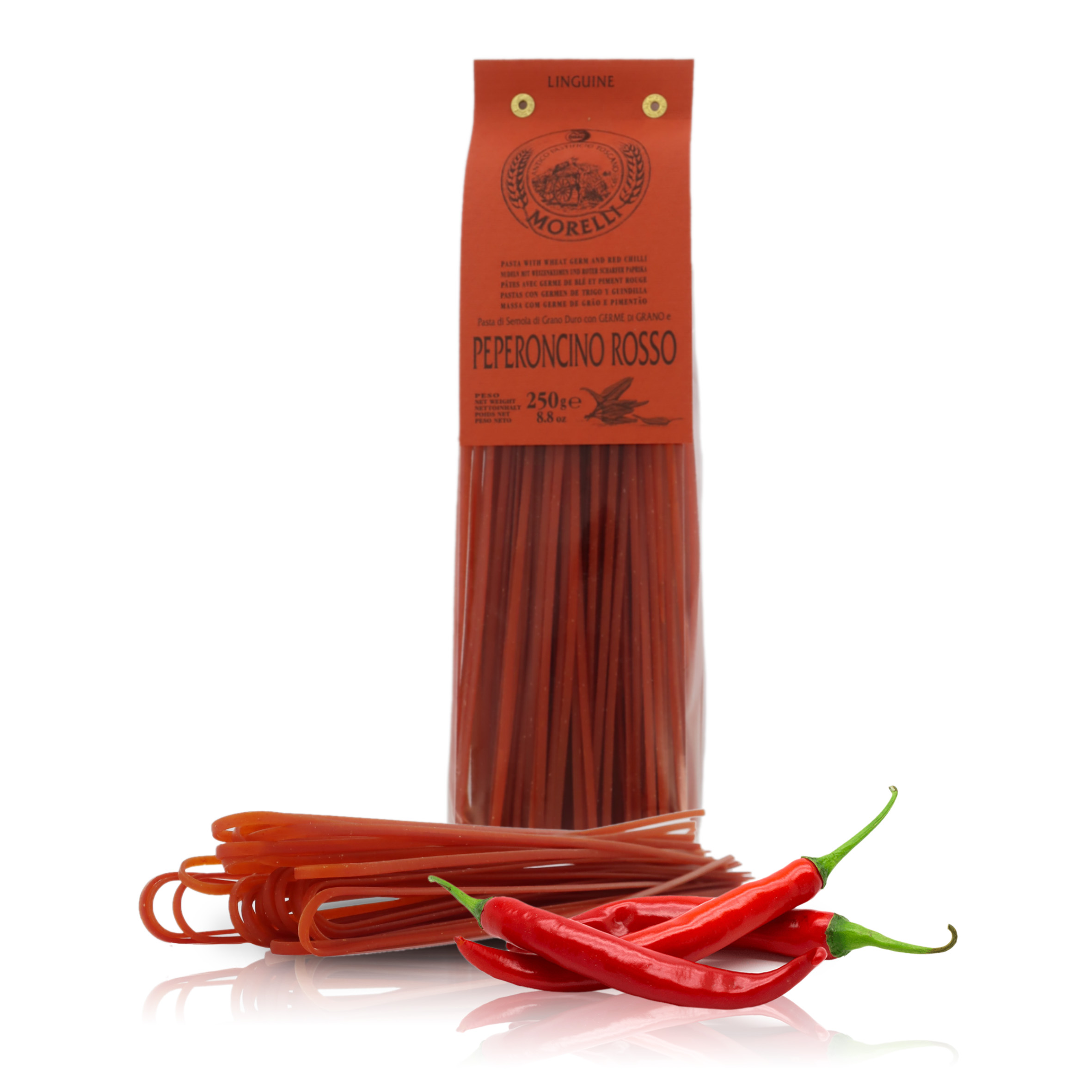 La pasta Morelli è preparata artigianalmente in un pastificio a gestione familiare in provincia di Pisa, fondato nel 1860. Ormai da ben 5 generazioni, la pasta viene preparata usando ottime semole di grano duro e tecniche classiche, che includono trafilatura al bronzo ed essiccatura a basse temperature, nel pieno rispetto della tradizione. Fiore all'occhiello della produzione Morelli è la pasta al germe di grano, che impiega un ingrediente naturale solitamente scartato, che la lavorazione artigianale, invece, consente di reintrodurre nell'impasto, donando alla pasta un gusto e un aroma molto particolari. La gamma di paste Morelli include: pasta al germe di grano, le tipicità regionali, la pasta all'uovo e germe di grano, la pasta integrale di filiera Toscana e integrale Senatore Cappelli, pasta di legumi, pasta senza glutine, grani antichi, farro e kamut, pasta aromatizzata monogusto, multicolore e articoli da regalo.