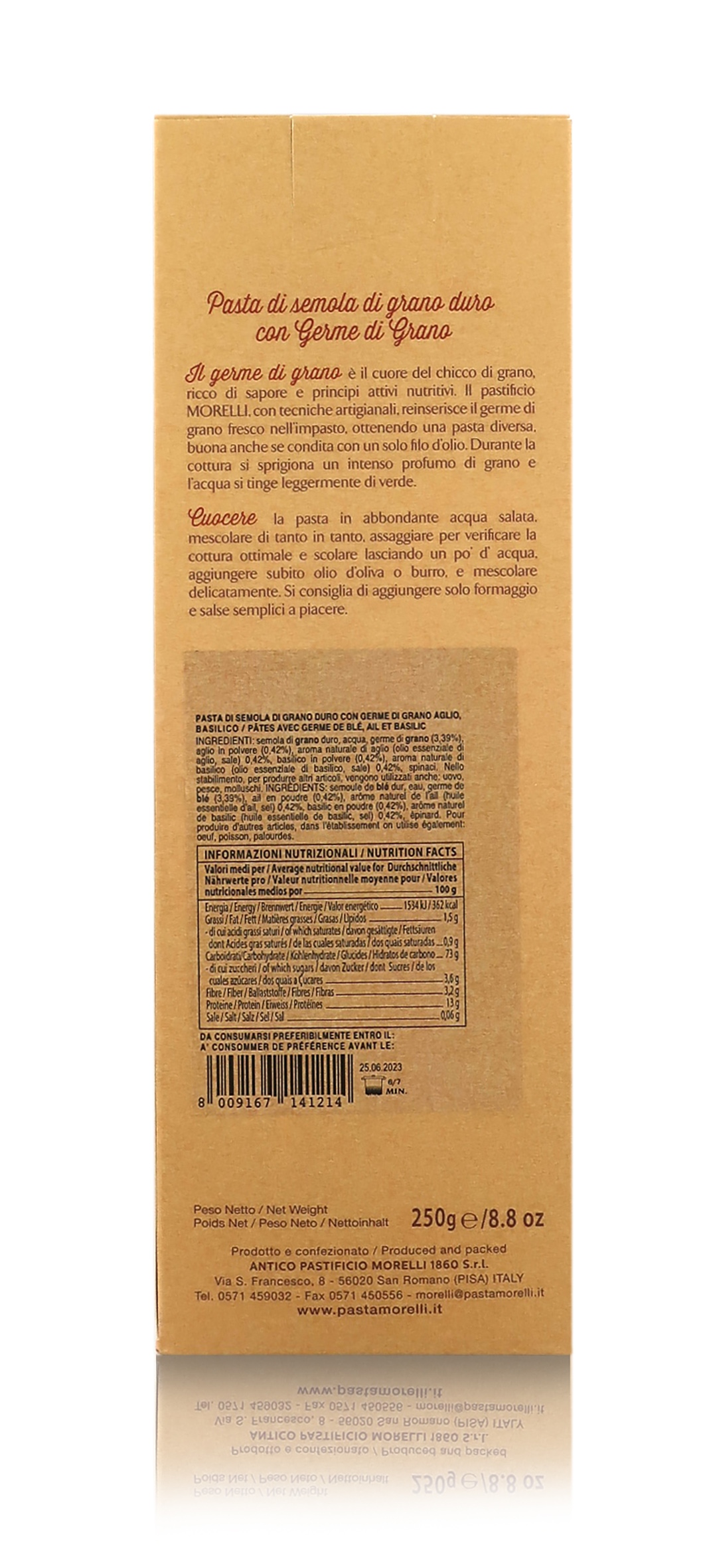Ingredienti: Semola di grano duro, Acqua, Germe di grano, Basilico in polvere, Aroma naturale di basilico (olio essenziale di basilico, sale), Aroma naturale di aglio (olio essenziale di aglio, sale), Aglio in polvere, Spinaci in polvere.