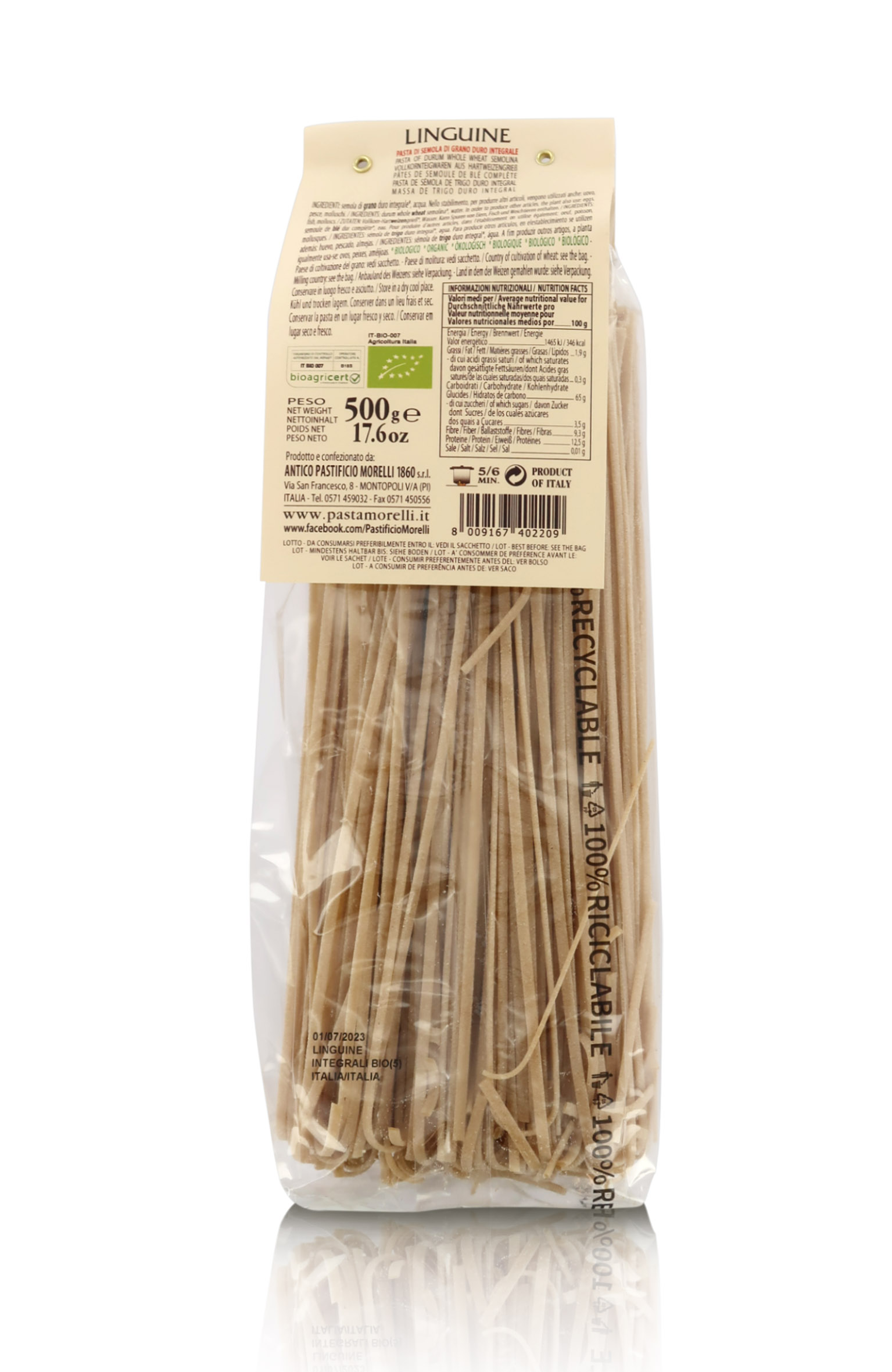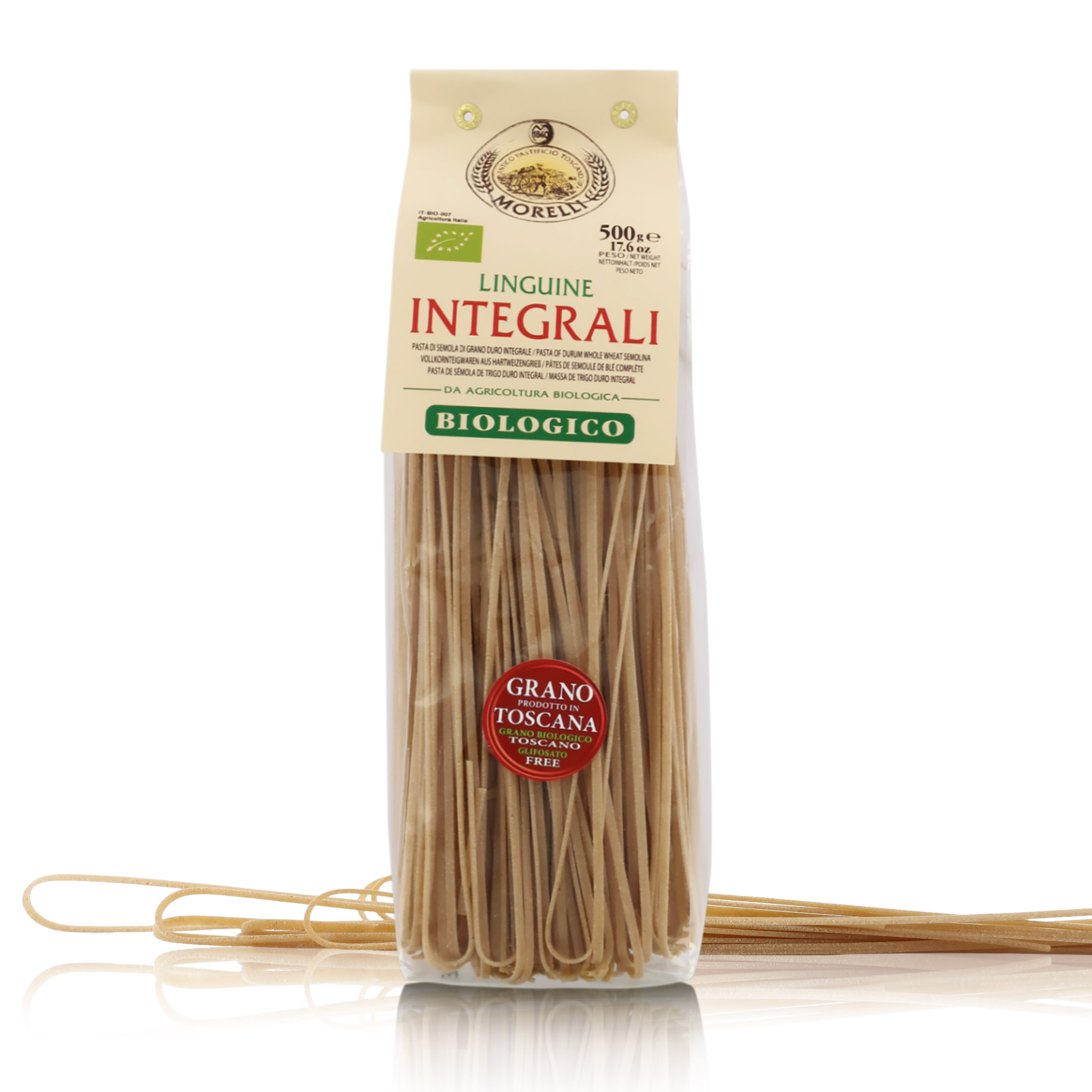 Linguine integrali ottenute da grano toscano senza glifosati, 8 confezioni da 500 grammi.