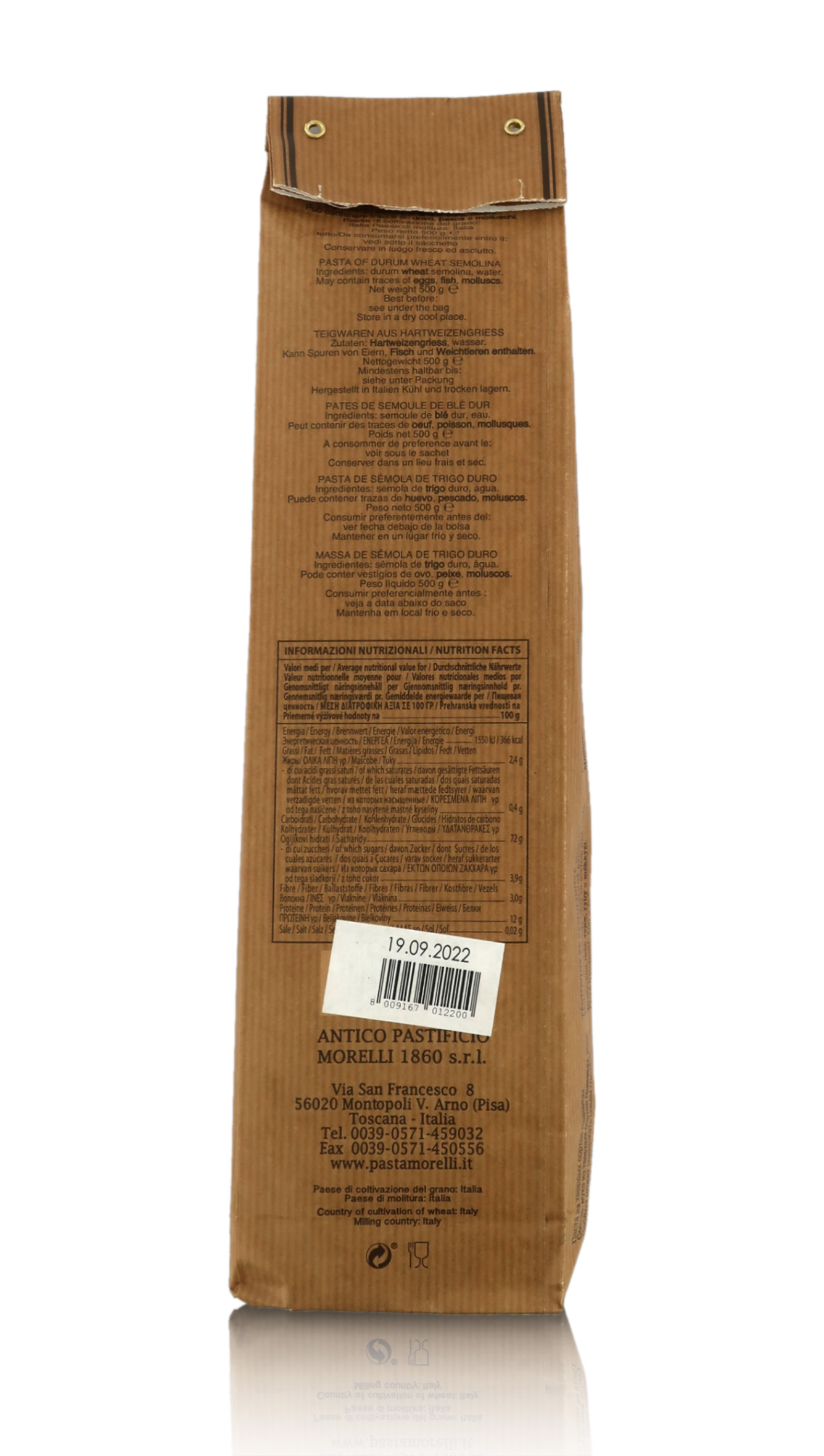 La pasta Morelli è preparata artigianalmente in un pastificio a gestione familiare in provincia di Pisa, fondato nel 1860. Ormai da ben 5 generazioni, la pasta viene preparata usando ottime semole di grano duro e tecniche classiche, che includono trafilatura al bronzo ed essiccatura a basse temperature, nel pieno rispetto della tradizione. Fiore all'occhiello della produzione Morelli è la pasta al germe di grano, che impiega un ingrediente naturale solitamente scartato, che la lavorazione artigianale, invece, consente di reintrodurre nell'impasto, donando alla pasta un gusto e un aroma molto particolari. La gamma di paste Morelli include: pasta al germe di grano, le tipicità regionali, la pasta all'uovo e germe di grano, la pasta integrale di filiera Toscana e integrale Senatore Cappelli, pasta di legumi, pasta senza glutine, grani antichi, farro e kamut, pasta aromatizzata monogusto, multicolore e articoli da regalo.