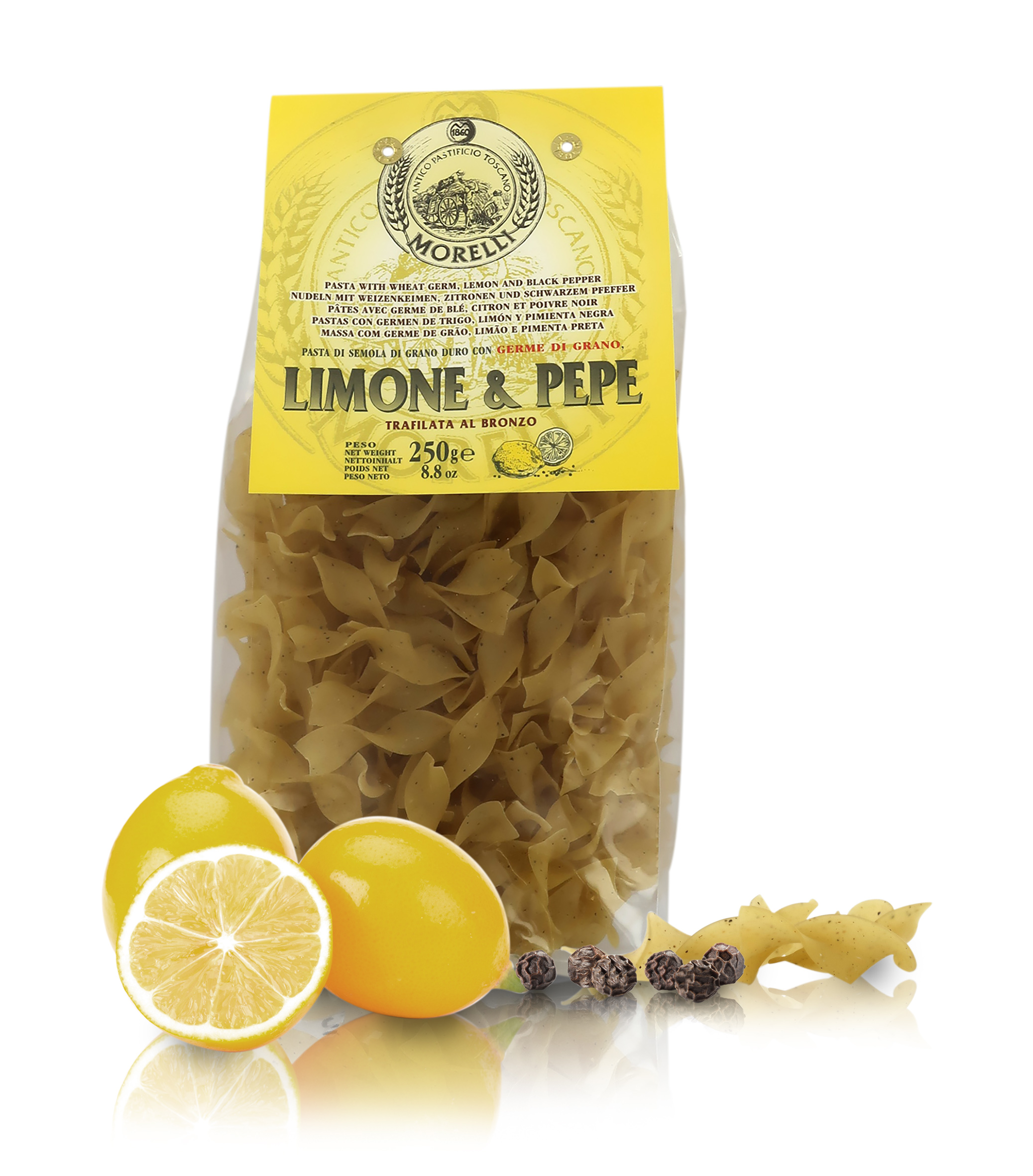 Ingredienti: Semola di grano duro, Acqua, Germe di grano, Aroma naturale di limone, Succo concentrato di limone in polvere, Pepe nero in polvere.