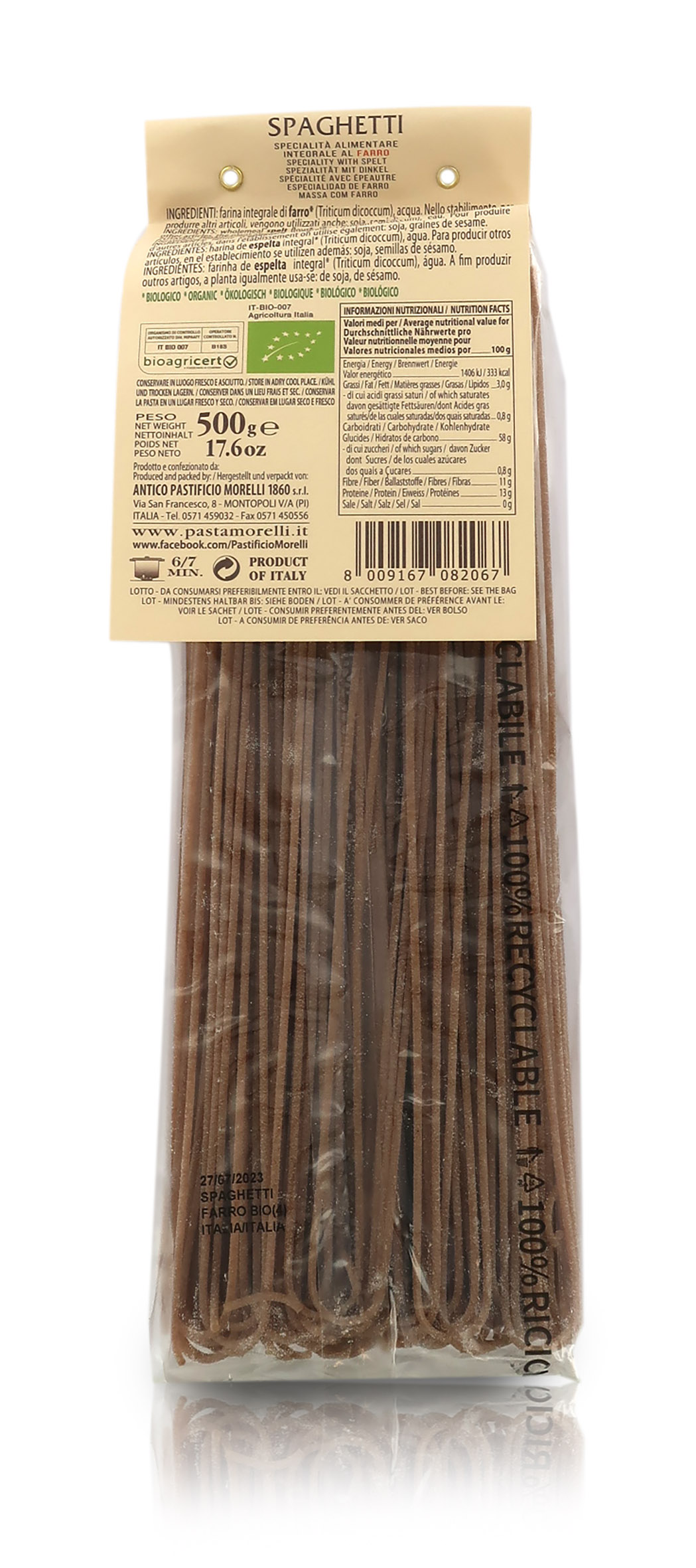 Pasta integrale al farro bio (triticum dicoccum), formato "Spaghetti" (linea "I Cereali Bio"), 6 pacchetti da 500 grammi.