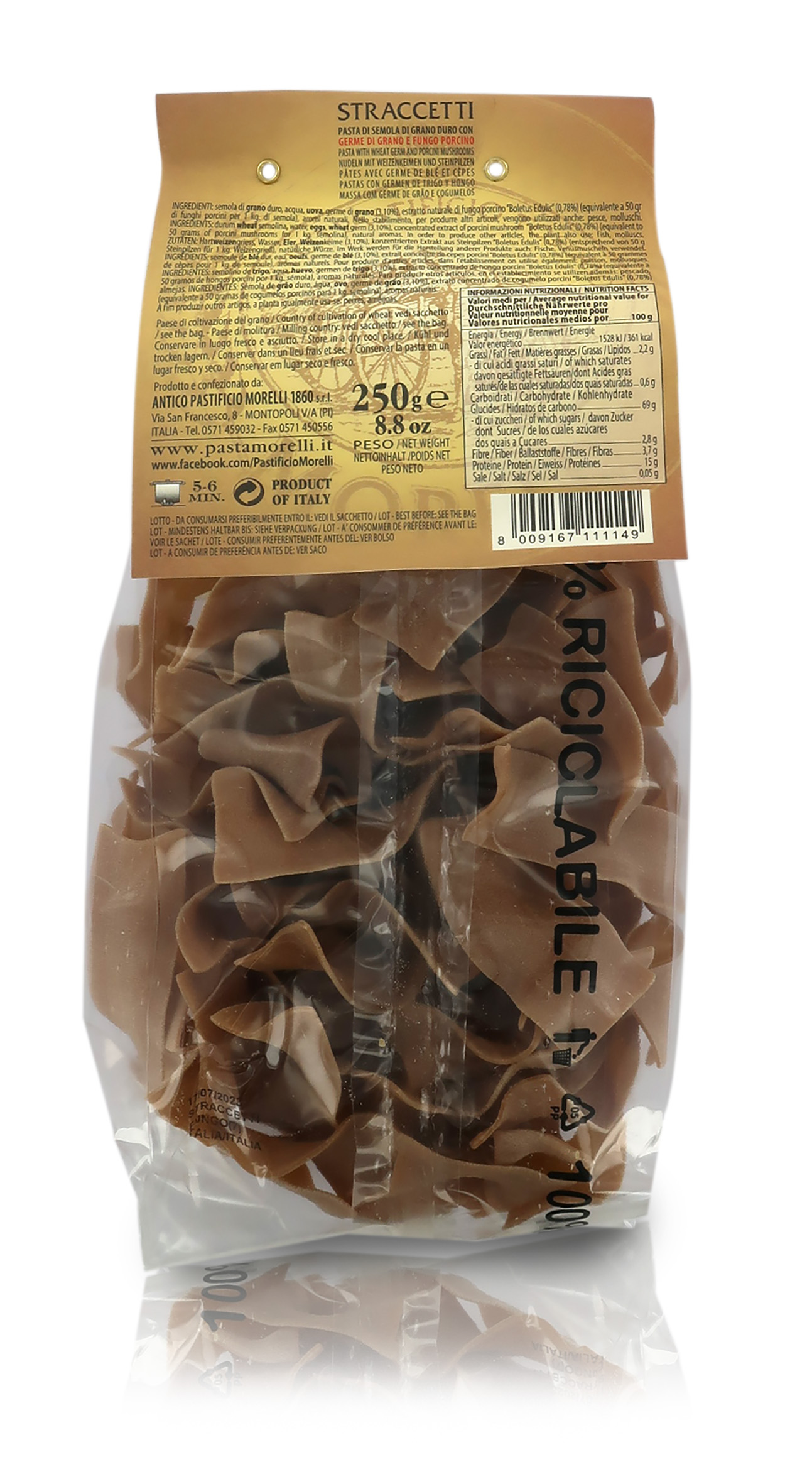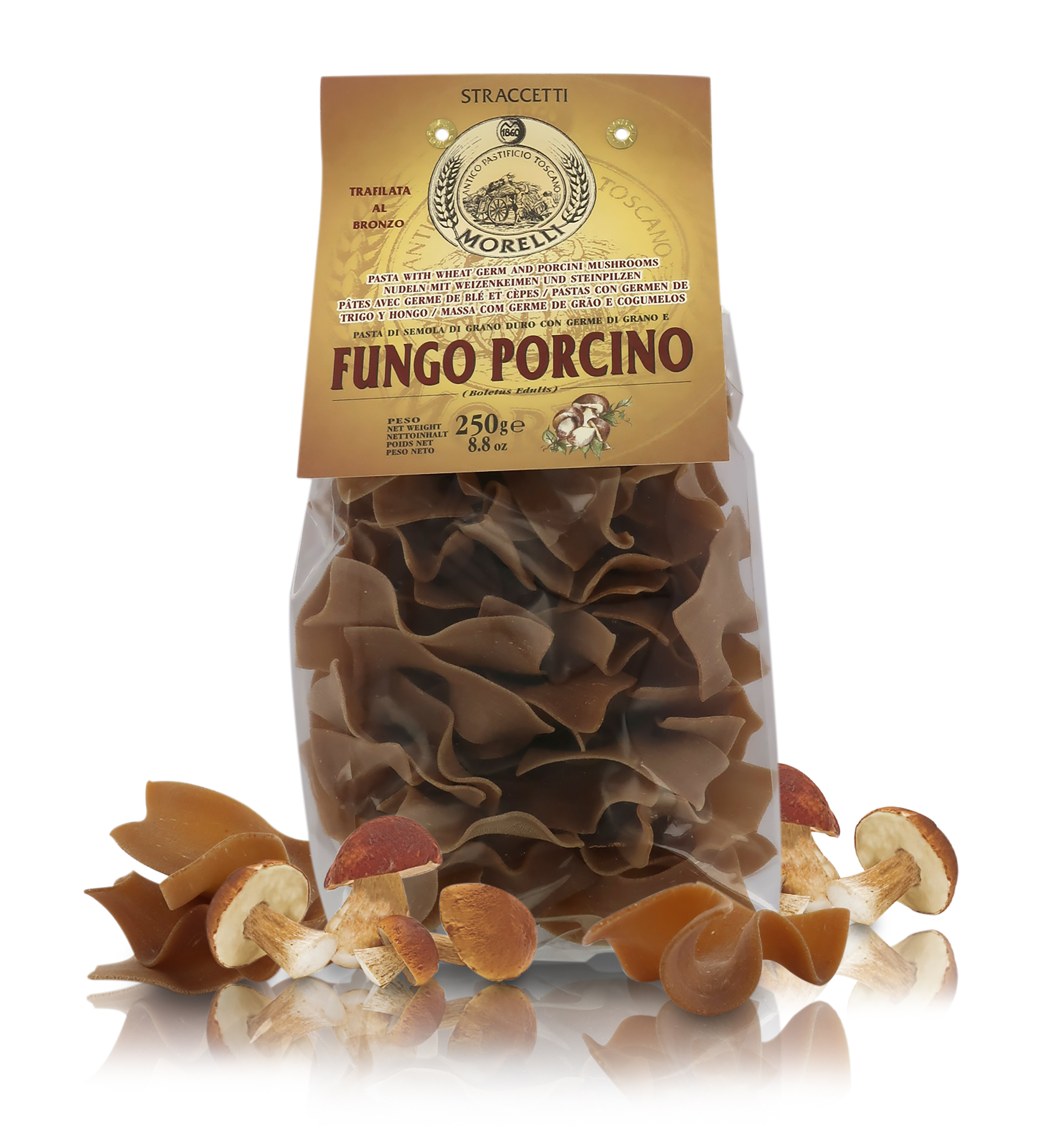 Ingredienti: semola di grano duro, acqua, uova, germe di grano, estratto naturale di fungo porcino (boletus edulis) pari a 50g di fungo porcino per 1 Kg di semola, aromi naturali.