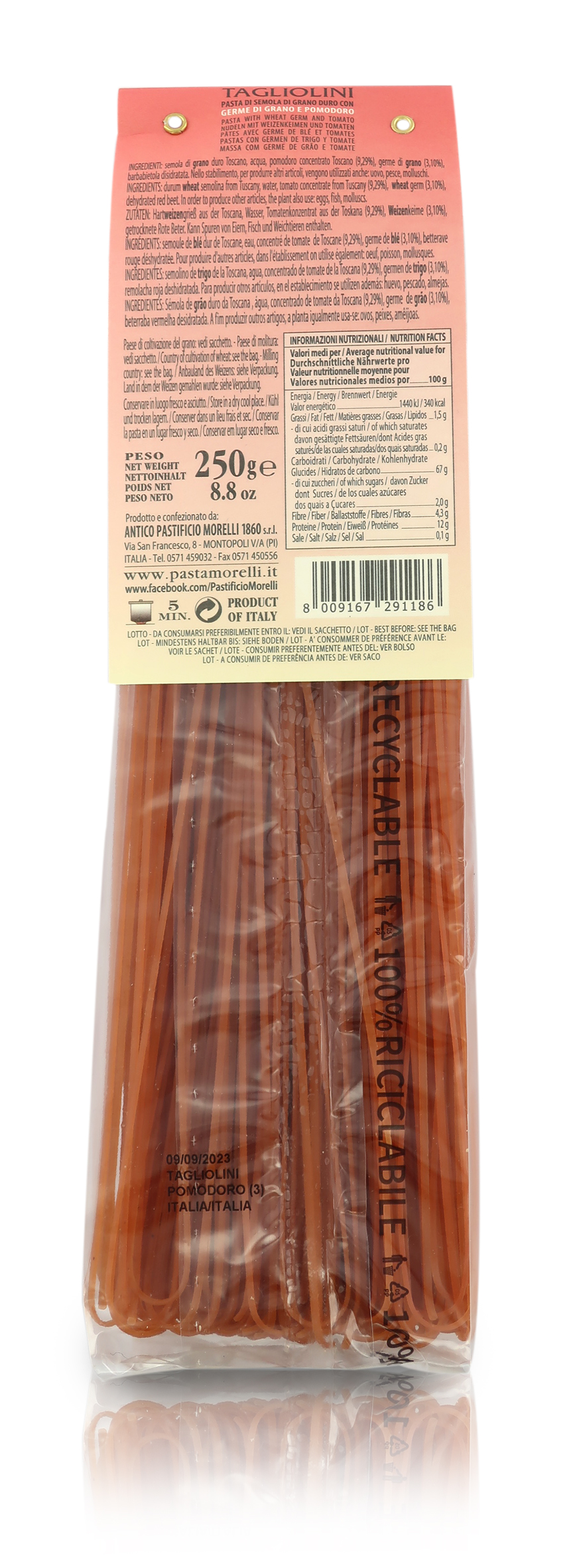 Ingredienti: Semola di grano duro toscana, Acqua, Concentrato di pomodoro toscano, Bietola rossa in polvere.