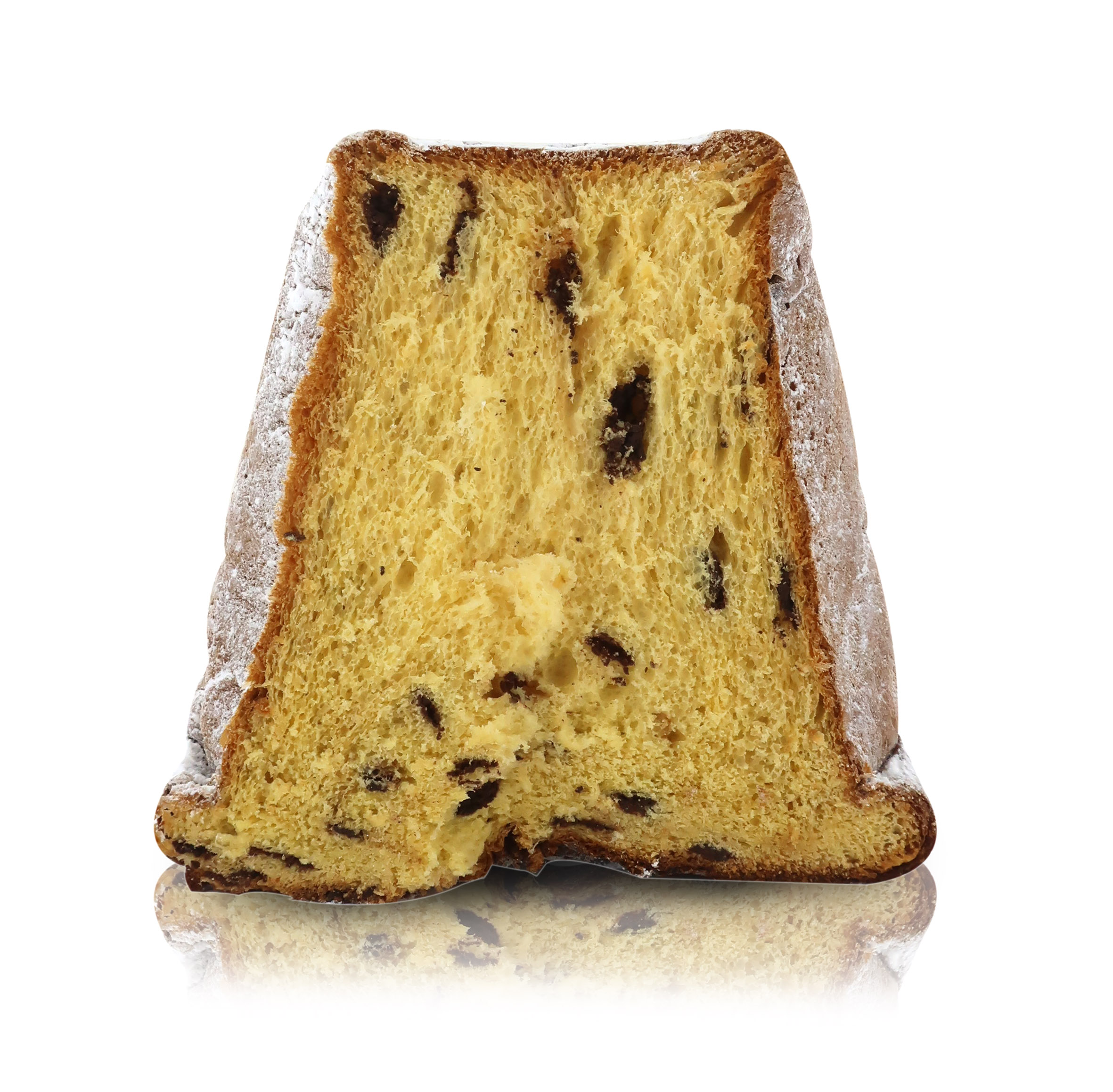 Prodotto da forno a lievitazione naturale con gocce di cioccolato e zucchero a velo.