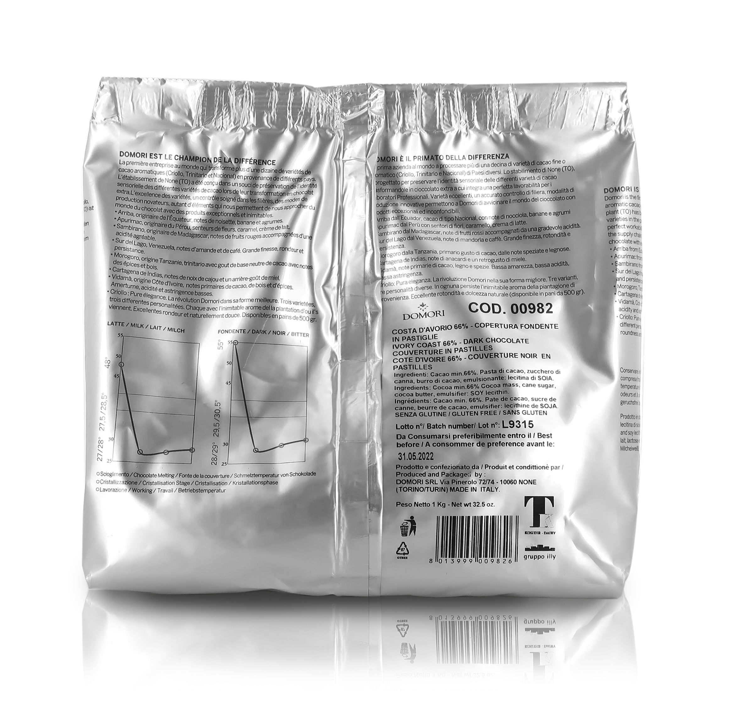 Pensato appositamente per il canale della ristorazione, questo comodo sacco da 1 kg di coperture di cioccolato fondente al 66 % in pastiglie permette una facile e veloce creazione di molti dolci, che essi siano per colazione, pranzo o cena.