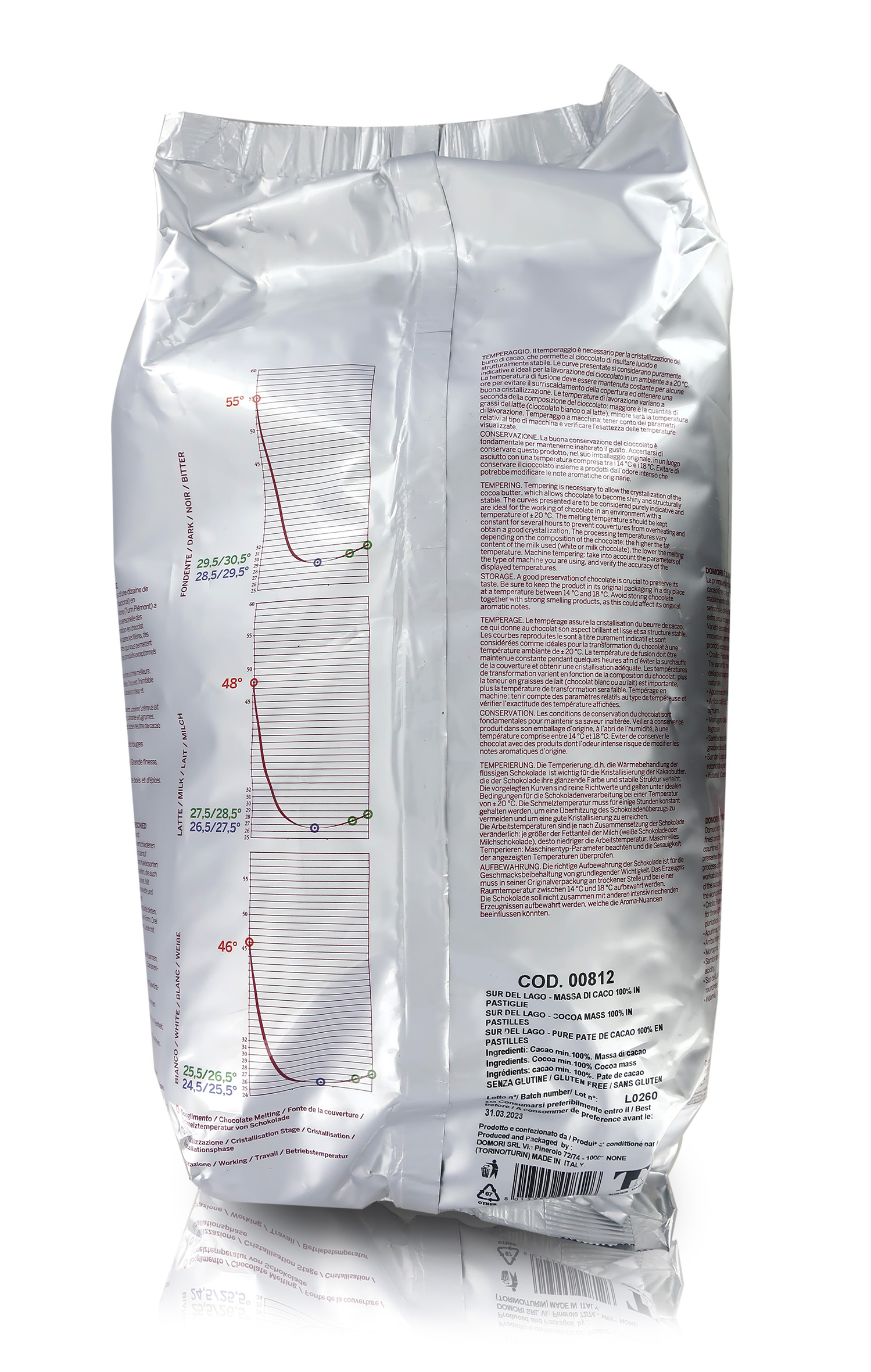 Pensato appositamente per il canale della ristorazione e le pasticcerie, questo maxi sacco Domori da 5 kg di coperture di cioccolato fondente al 100 % della pregiata variante Sur del Lago in pastiglie permette una facile e veloce creazione di molti dolci, che essi siano per colazione, pranzo o cena.