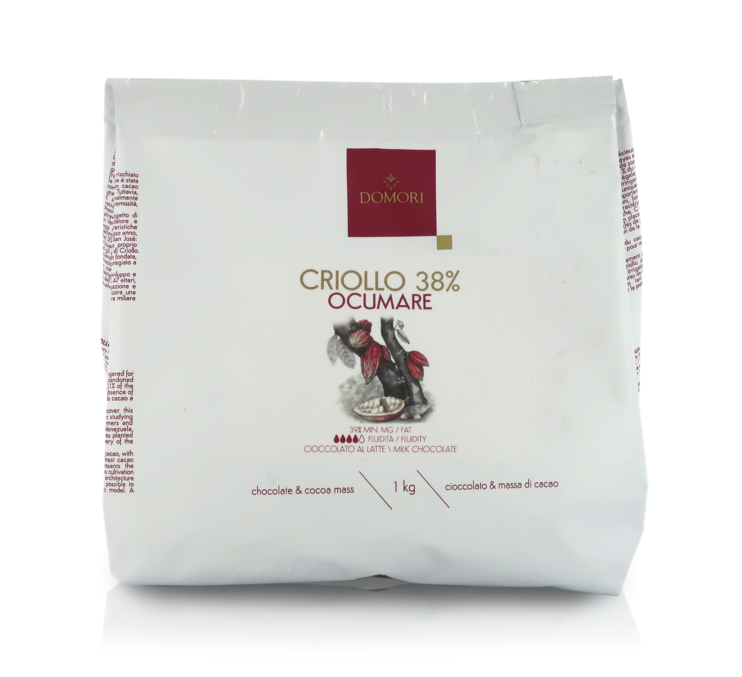 Gocce di cioccolato gourmet particolarmente raccomandate per decorazioni e mousse. Sacchetto da 1 kg (2.2lb). Questo cioccolato al latte Ocumare realizzato con cacao Criollo 38% vanta una fluidità medio-alta e una materia grassa del 39% min. Il gusto è tipico del cioccolato al latte con note di caramello, tabacco, noci, papaia, sottobosco, funghi e datteri. Temperatura di scioglimento: 48 °C, cristallizzazione a circa 27/28 °C e lavorazione intorno ai 27,5/28,5 °C. Senza glutine e senza OGM.