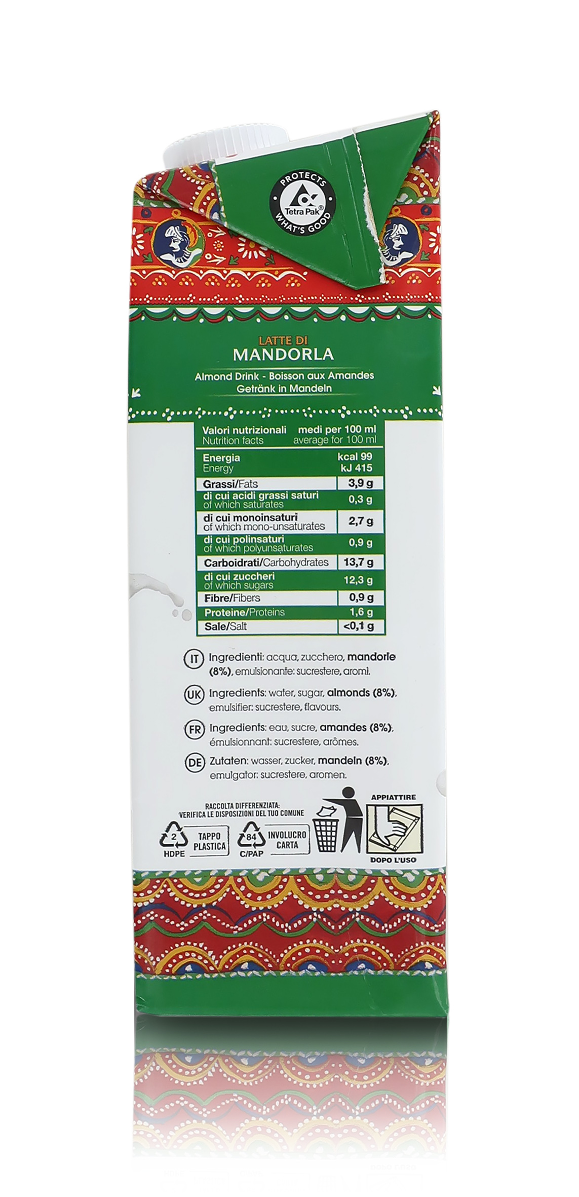Ingredienti: acqua, zucchero, MANDORLE (8%) (origine California), emulsionante: sucrestere; aromi. Il latte di mandorla può contenere tracce di altra frutta a guscio e soia. 100% vegetale, senza glutine e senza lattosio.