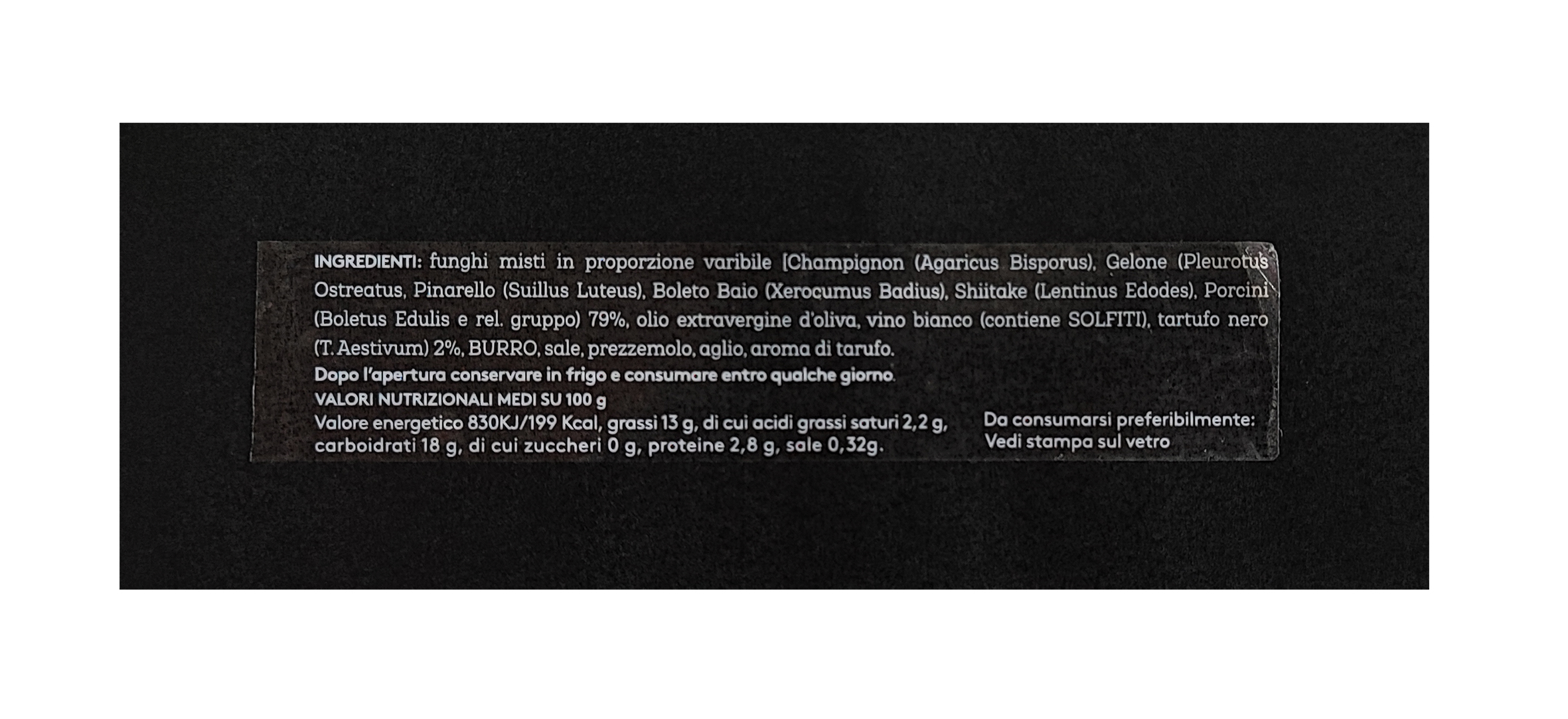 Ingredienti: funghi misti in proporzione variabile [Champignon (Agaricus Bisporus), Gelone (Pleurotus Ostreatus), Pinarello (Suillus Luteus), Boleto Baio (Xerocumus Badius), Shiitake (Lentinus Edodes), Porcini (Boletus Edulis e rel. gruppo) 79%, olio extravergine di oliva, vino bianco (contiene SOLFITI), tartufo nero (T. Aestivum) 2%, BURRO, sale, prezzemolo, aglio, aroma di tartufo. Prodotto in uno stabilimento che utilizza SEDANO, FRUTTA SECCA IN GUSCIO, PESCE, PANE, SENAPE, PRODOTTI A BASE DI LATTE E DERIVATI DELLE UOVA.