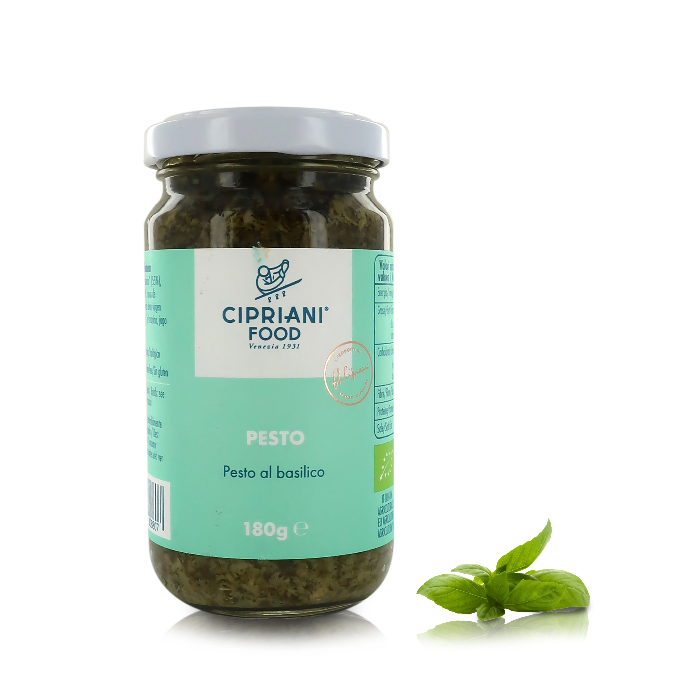 Pesto Cipriani: 100% basilico toscano e olio extravergine di oliva. Un pesto dal gusto deciso, il basilico Cipriani viene lavorato nel più breve tempo possibile, in modo da mantenere tutto l’aroma e il gusto delle foglie appena raccolte. L’assenza di aglio e formaggio tra gli ingredienti lo rende più digeribile. Da utilizzare non solo per condire la pasta, ma anche da spalmare direttamente sul pane, o come condimento sulle patate lesse e sulle carni, a mo' di salsa verde. Da impiegare su pietanze già calde, quindi non necessita di essere scaldato (da consumare a temperatura ambiente).