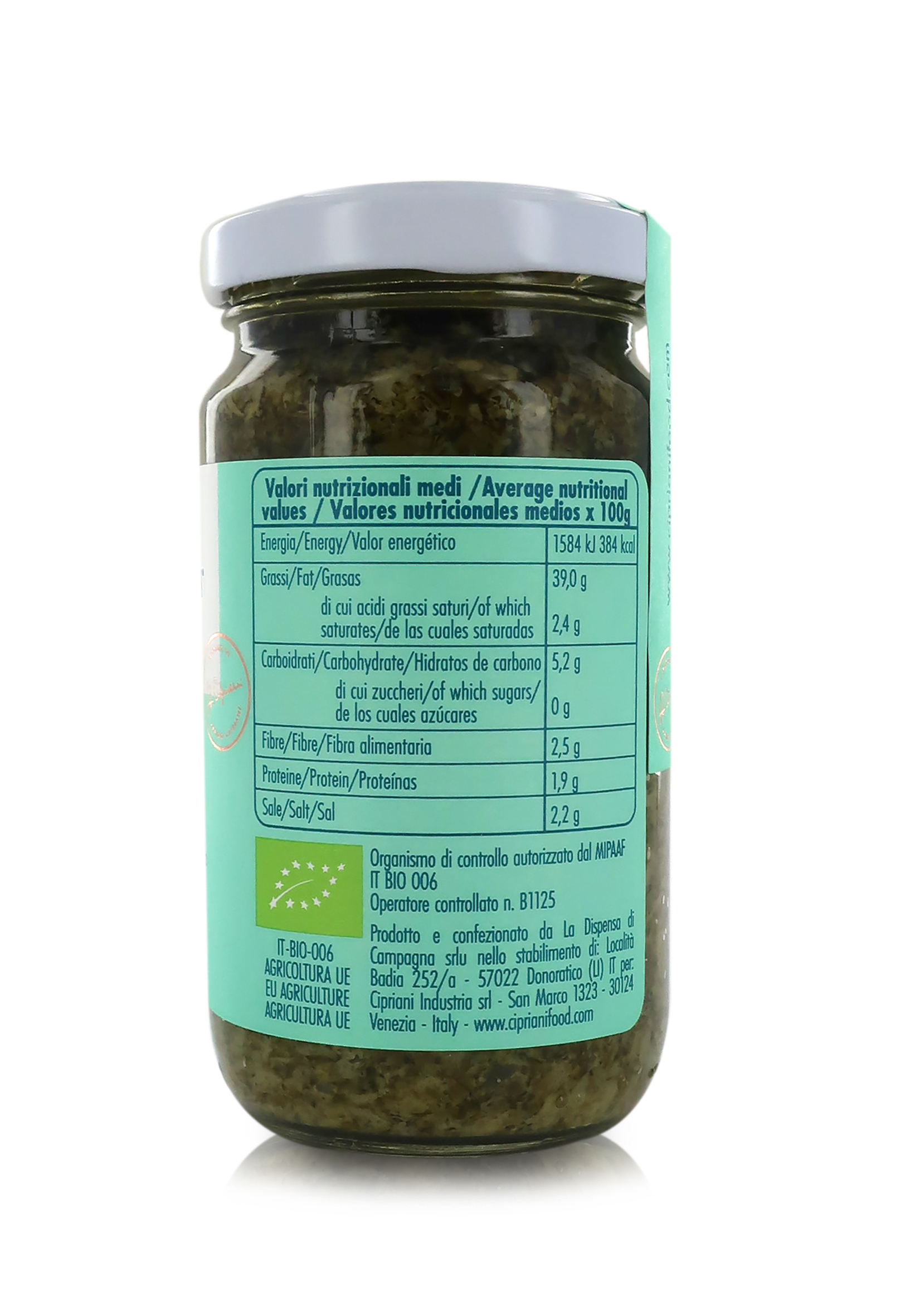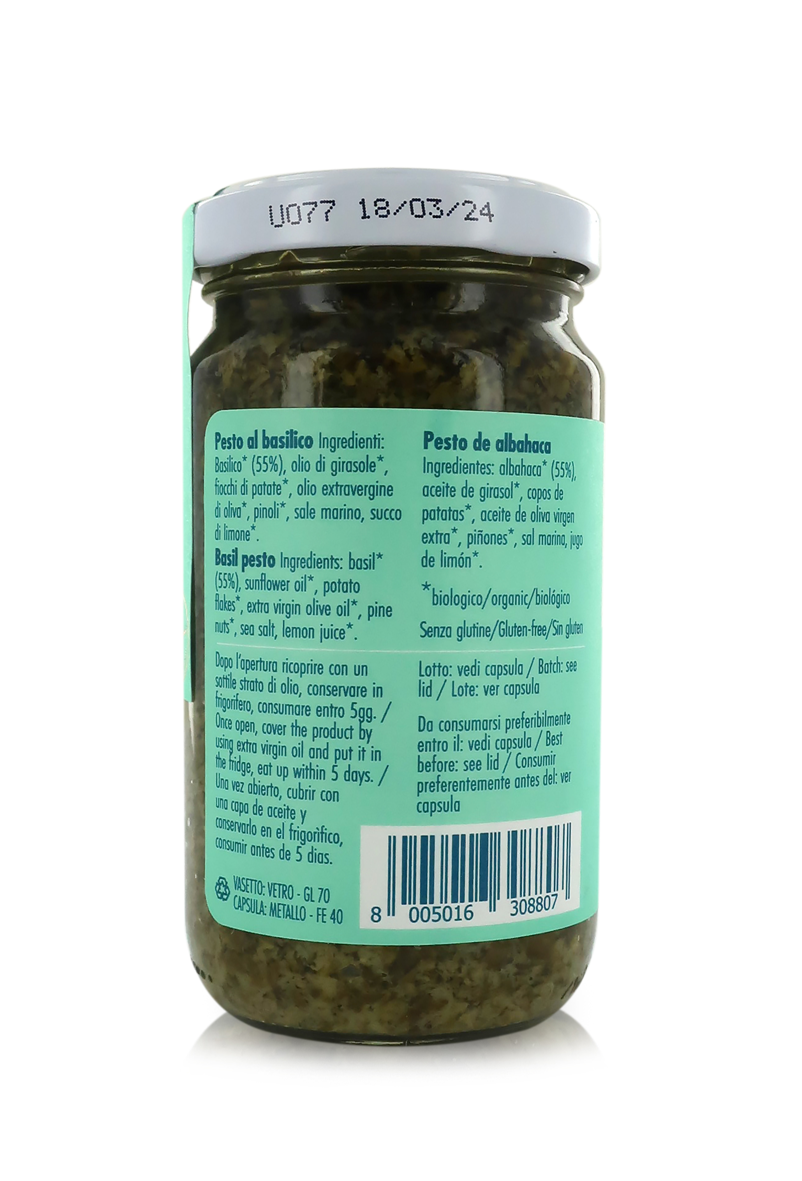 Pesto biologico (agricoltura EU) dal gusto genuino e autentico, in pratico vasetto di vetro da 180g - confezione da 6 vasetti. Si distingue dagli altri pesti in commercio grazie alla pronunciata nota erbacea/vegetale, simbolo di una materia prima, il basilico, che viene lavorata freschissima.