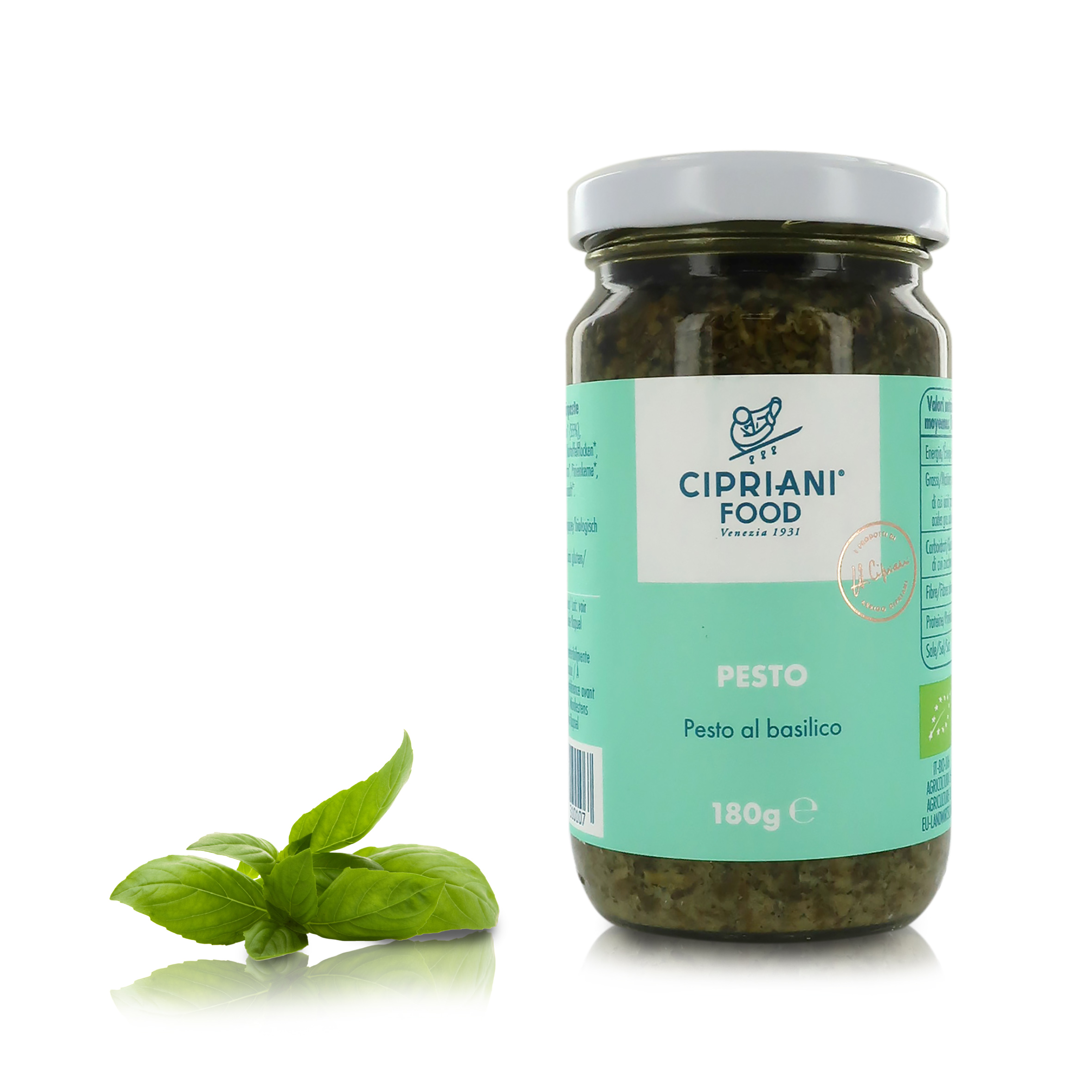 Pesto Cipriani: 100% basilico toscano e olio extravergine di oliva. Un pesto dal gusto deciso, il basilico Cipriani viene lavorato nel più breve tempo possibile, in modo da mantenere tutto l’aroma e il gusto delle foglie appena raccolte. L’assenza di aglio e formaggio tra gli ingredienti lo rende più digeribile. Da utilizzare non solo per condire la pasta, ma anche da spalmare direttamente sul pane, o come condimento sulle patate lesse e sulle carni, a mo' di salsa verde. Da impiegare su pietanze già calde, quindi non necessita di essere scaldato (da consumare a temperatura ambiente).