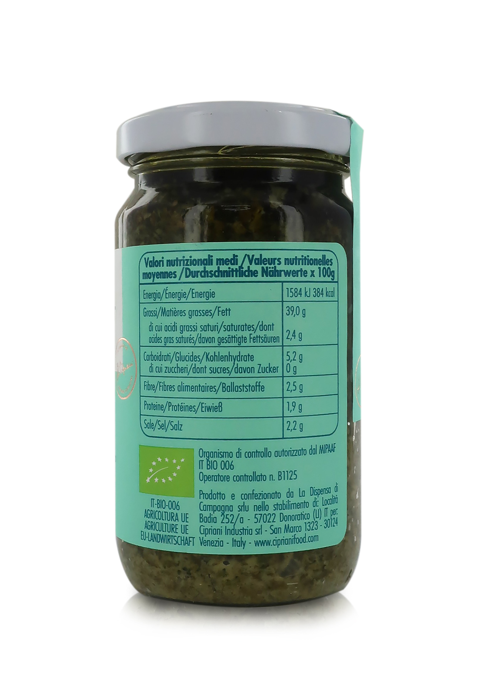 Pesto biologico (agricoltura EU) dal gusto genuino e autentico, in pratico vasetto di vetro da 180g - confezione da 6 vasetti. Si distingue dagli altri pesti in commercio grazie alla pronunciata nota erbacea/vegetale, simbolo di una materia prima, il basilico, che viene lavorata freschissima.