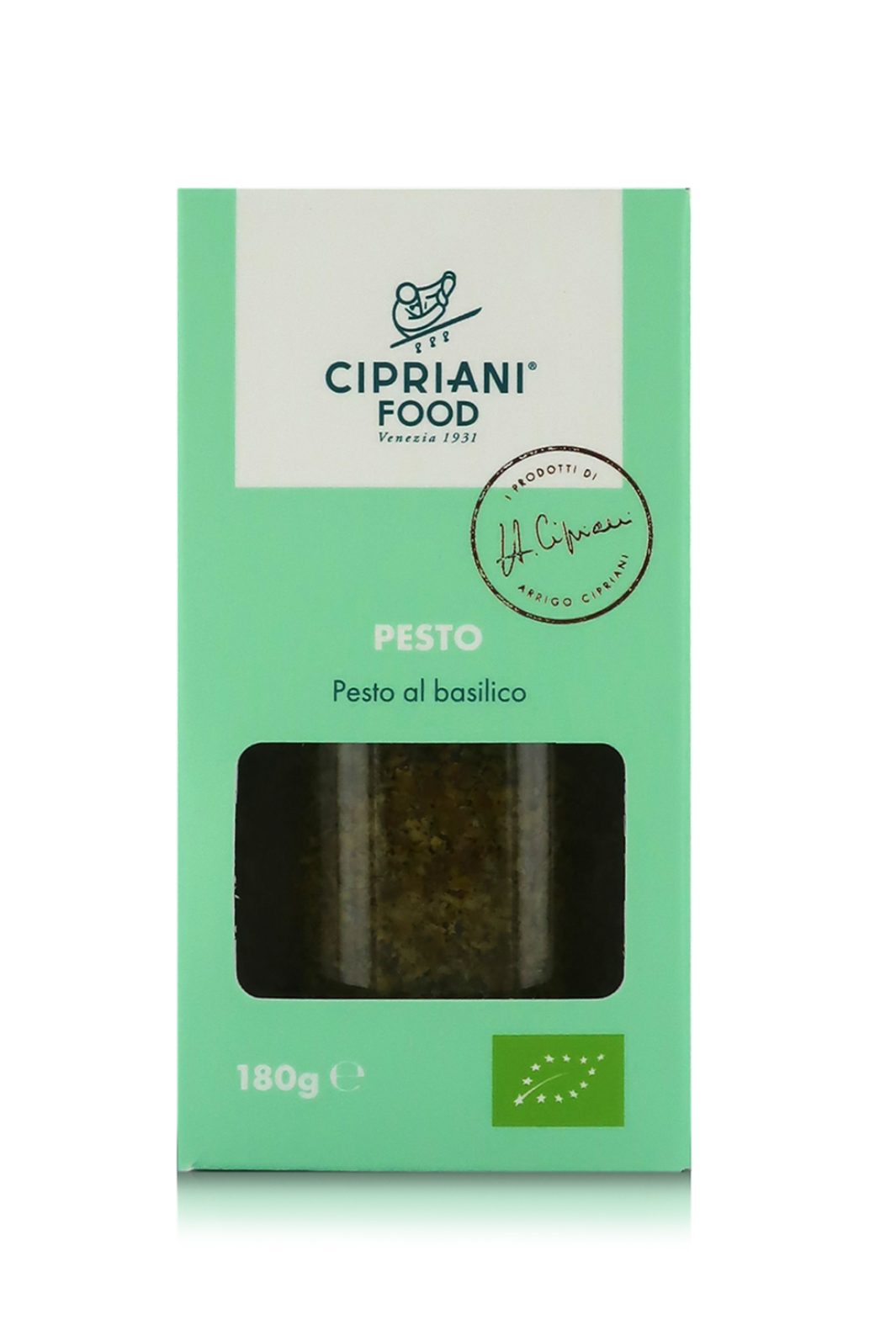Pesto Cipriani: 100% basilico toscano e olio extravergine di oliva. Un pesto dal gusto deciso, il basilico Cipriani viene lavorato nel più breve tempo possibile, in modo da mantenere tutto l’aroma e il gusto delle foglie appena raccolte. L’assenza di aglio e formaggio tra gli ingredienti lo rende più digeribile. Da utilizzare non solo per condire la pasta, ma anche da spalmare direttamente sul pane, o come condimento sulle patate lesse e sulle carni, a mo' di salsa verde. Da impiegare su pietanze già calde, quindi non necessita di essere scaldato (da consumare a temperatura ambiente).