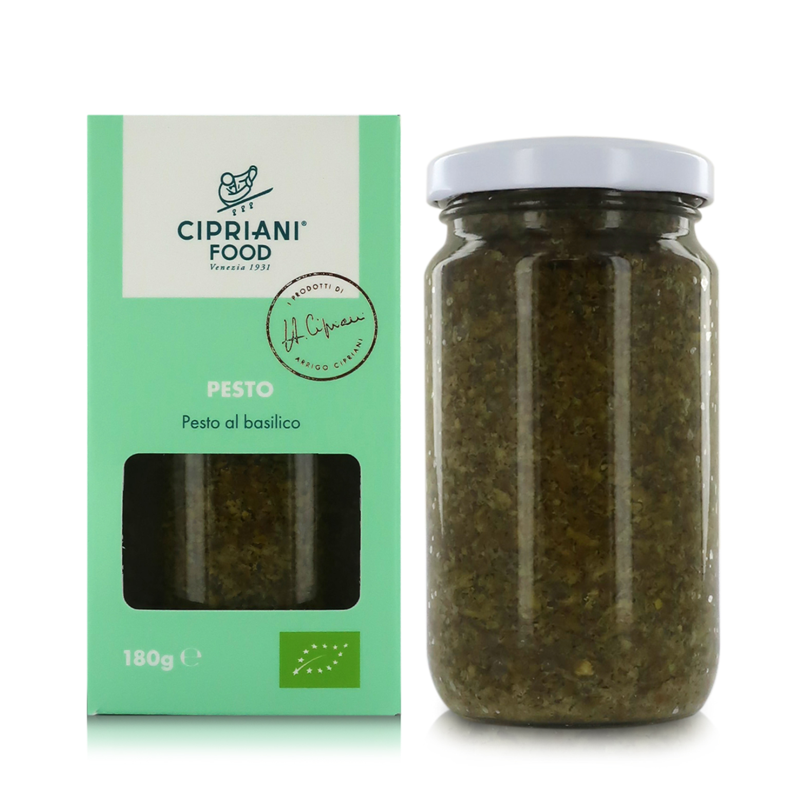 Pesto Cipriani: 100% basilico toscano e olio extravergine di oliva. Un pesto dal gusto deciso, il basilico Cipriani viene lavorato nel più breve tempo possibile, in modo da mantenere tutto l’aroma e il gusto delle foglie appena raccolte. L’assenza di aglio e formaggio tra gli ingredienti lo rende più digeribile. Da utilizzare non solo per condire la pasta, ma anche da spalmare direttamente sul pane, o come condimento sulle patate lesse e sulle carni, a mo' di salsa verde. Da impiegare su pietanze già calde, quindi non necessita di essere scaldato (da consumare a temperatura ambiente).