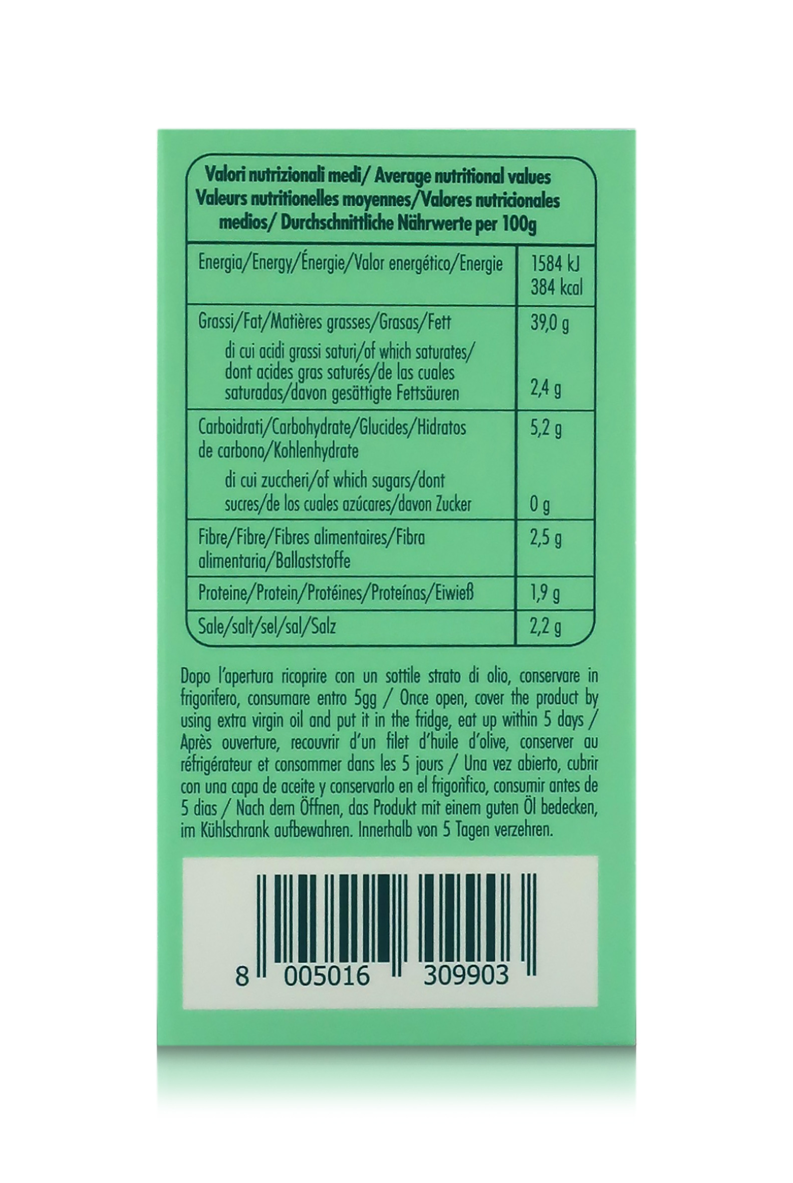 Si distingue dagli altri pesti in commercio grazie alla pronunciata nota erbacea/vegetale, simbolo di una materia prima, il basilico, che viene lavorata freschissima.