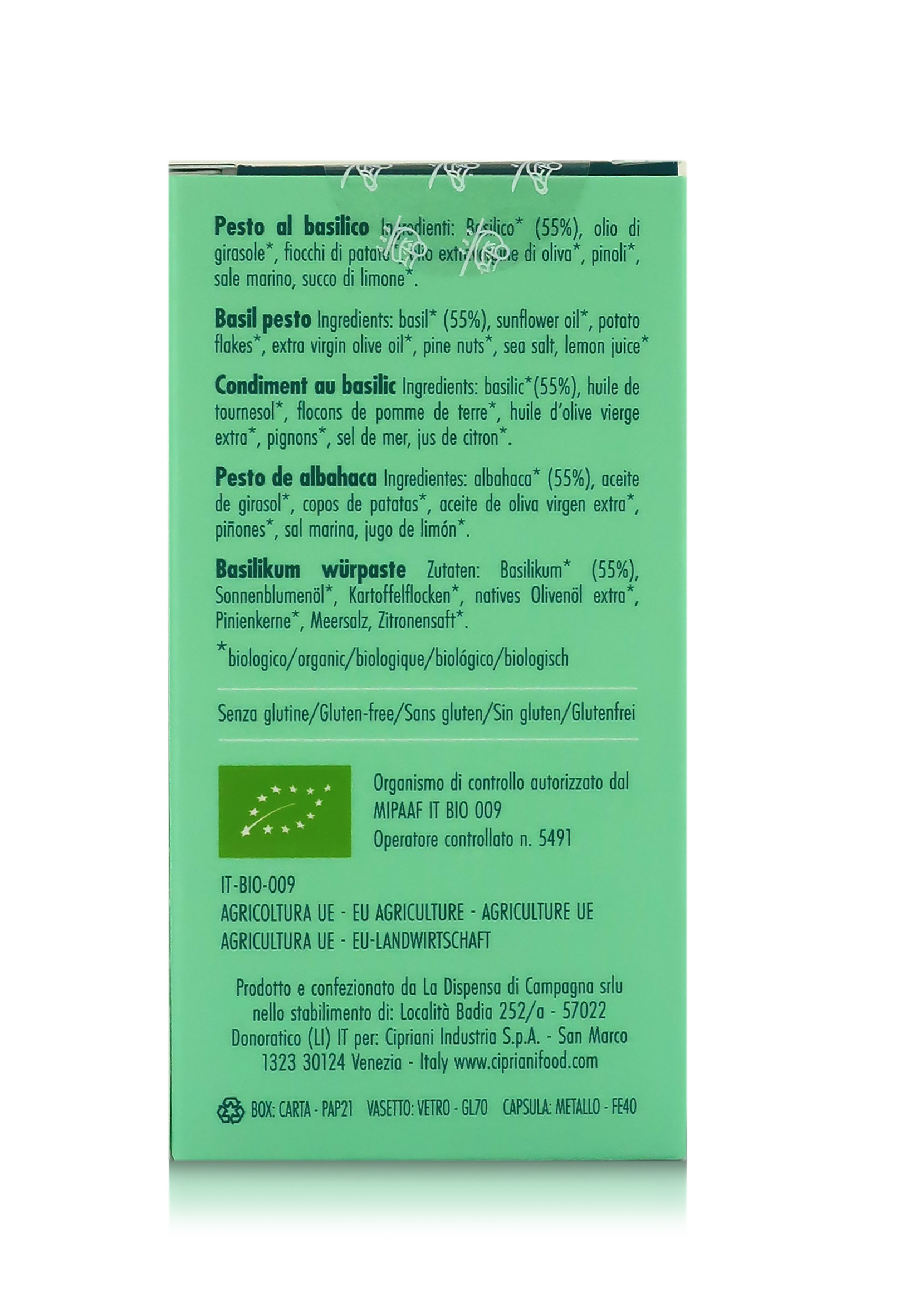 Cipriani Pesto di Basilico Bio Senza Aglio e Senza Formaggio, Pesto Leggero / Delicato, Agricoltura Biologica UE, Condimento per Pasta, Crostini o Verdure, Astucciato, 6x180g