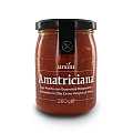 Sugo al gusto classico "amatriciana", pronto da scaldare (in soli 2/3 minuti) e da consumare. Contiene pomodoro pelato e olio extravergine di oliva, ed è insaporito con guanciale stagionato di maiale, cipolla, vino bianco, sale e pepe. Il gusto del pomodoro, unito alla grande sapidità del guanciale stagionato, sono protagonisti in questo sugo, condimento tra i più amati della tradizione culinaria italiana.