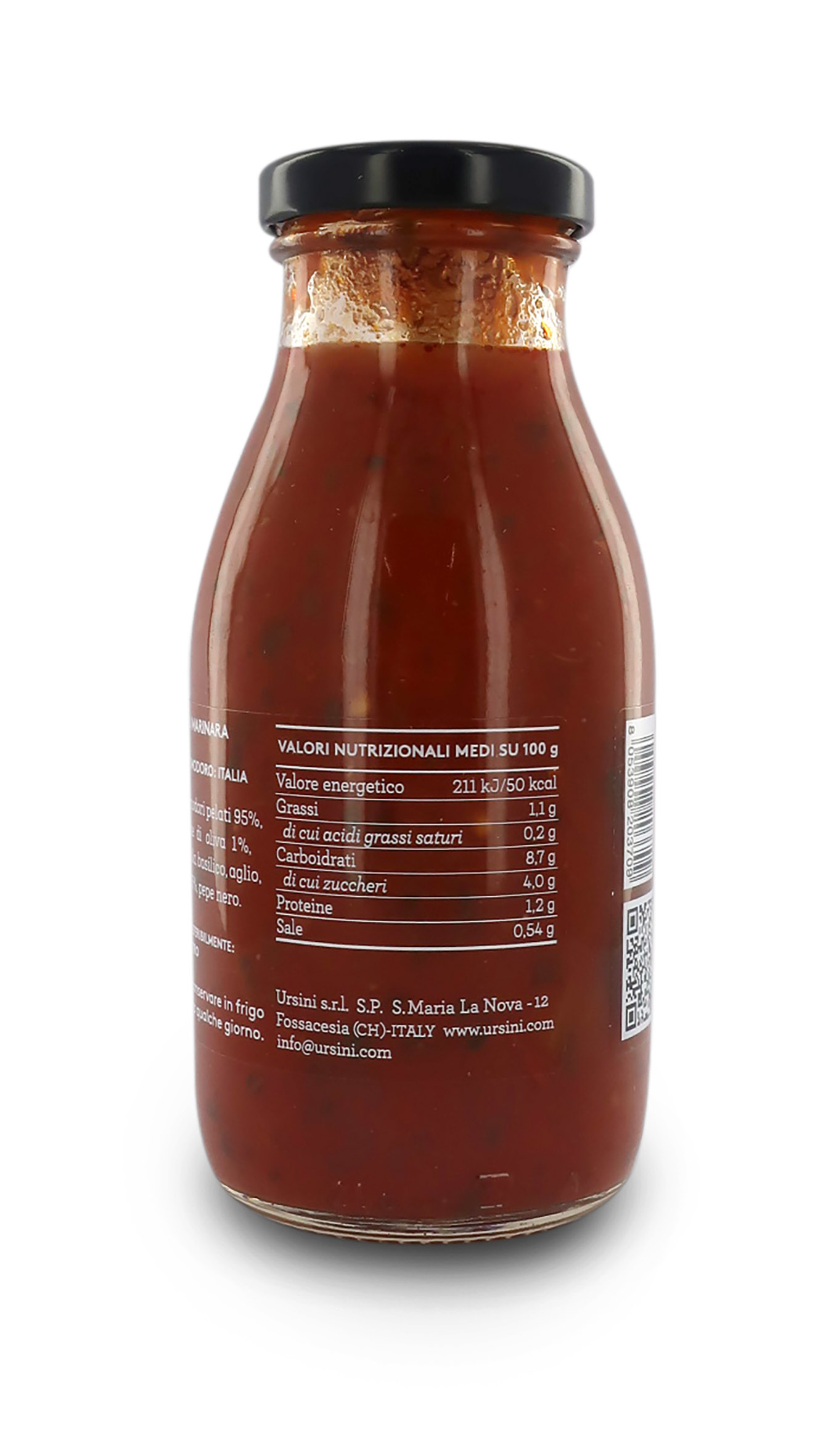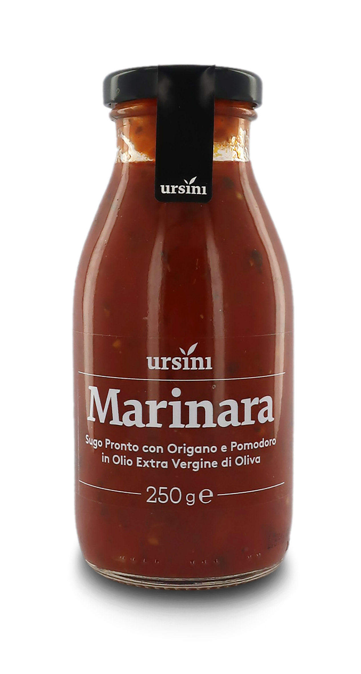 Sugo al gusto classico "marinara", pronto da scaldare e da consumare. Contiene pomodoro, origano e olio extravergine di oliva, ed è insaporito con prezzemolo, cipolla, basilico, aglio e pepe. La semplicità e la genuinità del gusto del pomodoro sono protagoniste in questo sugo, condimento tra i più classici della tradizione culinaria italiana.