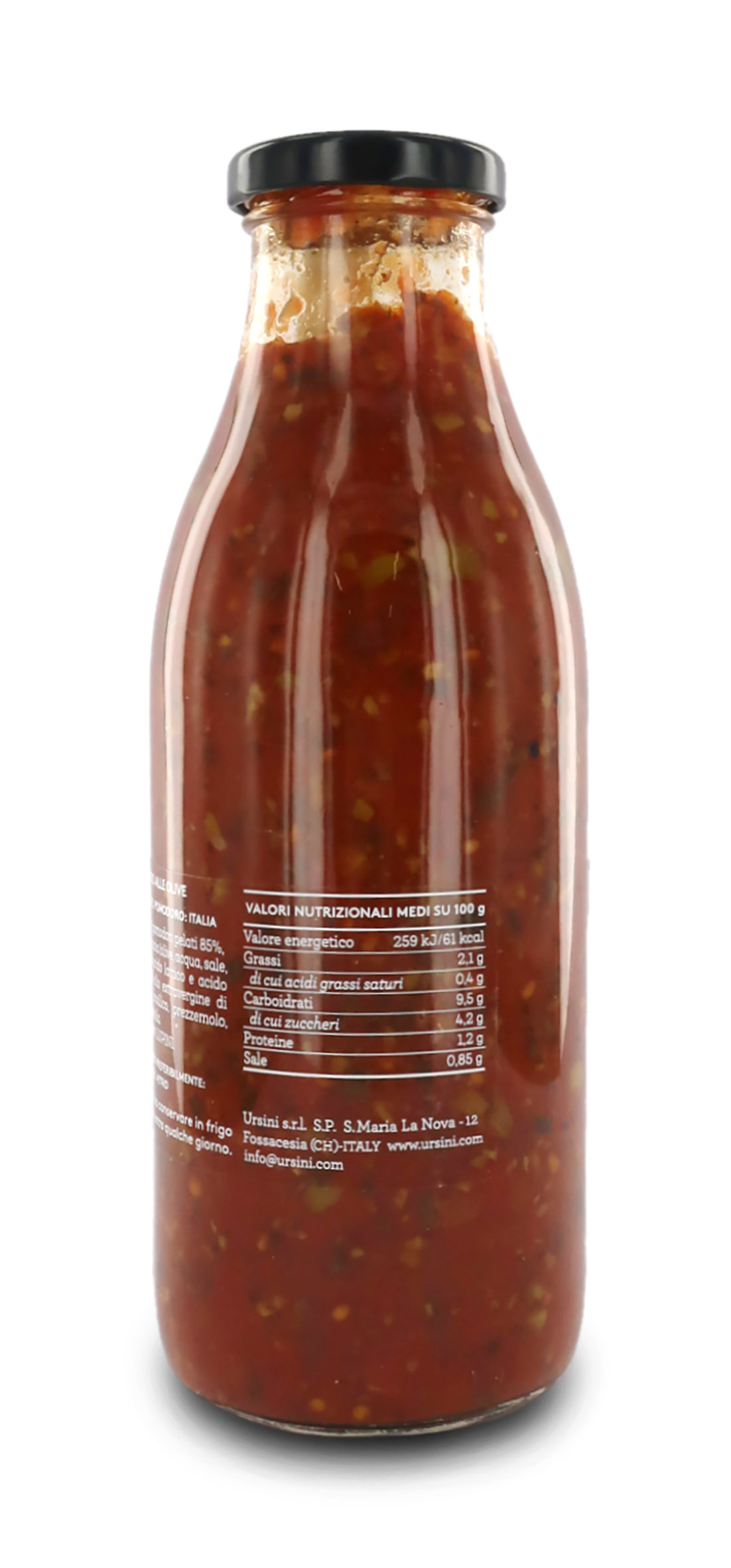 Ingredienti: pomodori pelati 96%, olio extravergine di oliva, basilico, sale, aglio, prezzemolo, peperoncino piccante 0,1%.