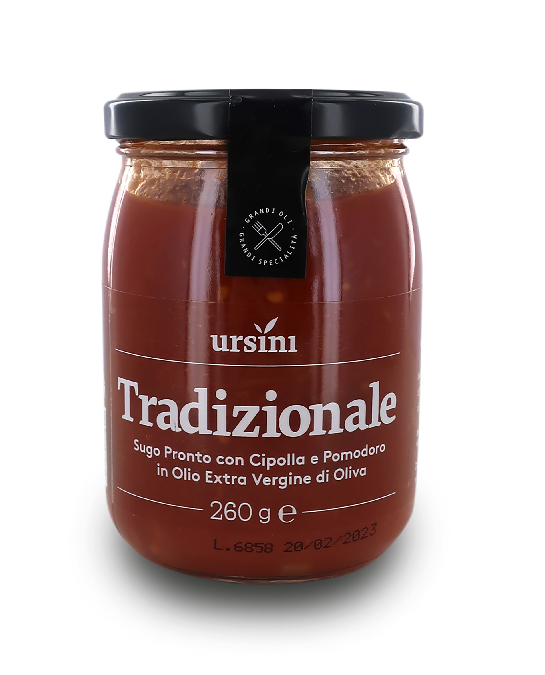 Sugo tradizionale al pomodoro, pronto da scaldare (2/3 min.) e da consumare. Contiene pomodoro pelato, olio extravergine di oliva e cipolla. La semplicità e la genuinità del gusto del pomodoro rende questo condimento uno dei più amati sughi della tradizione culinaria italiana.