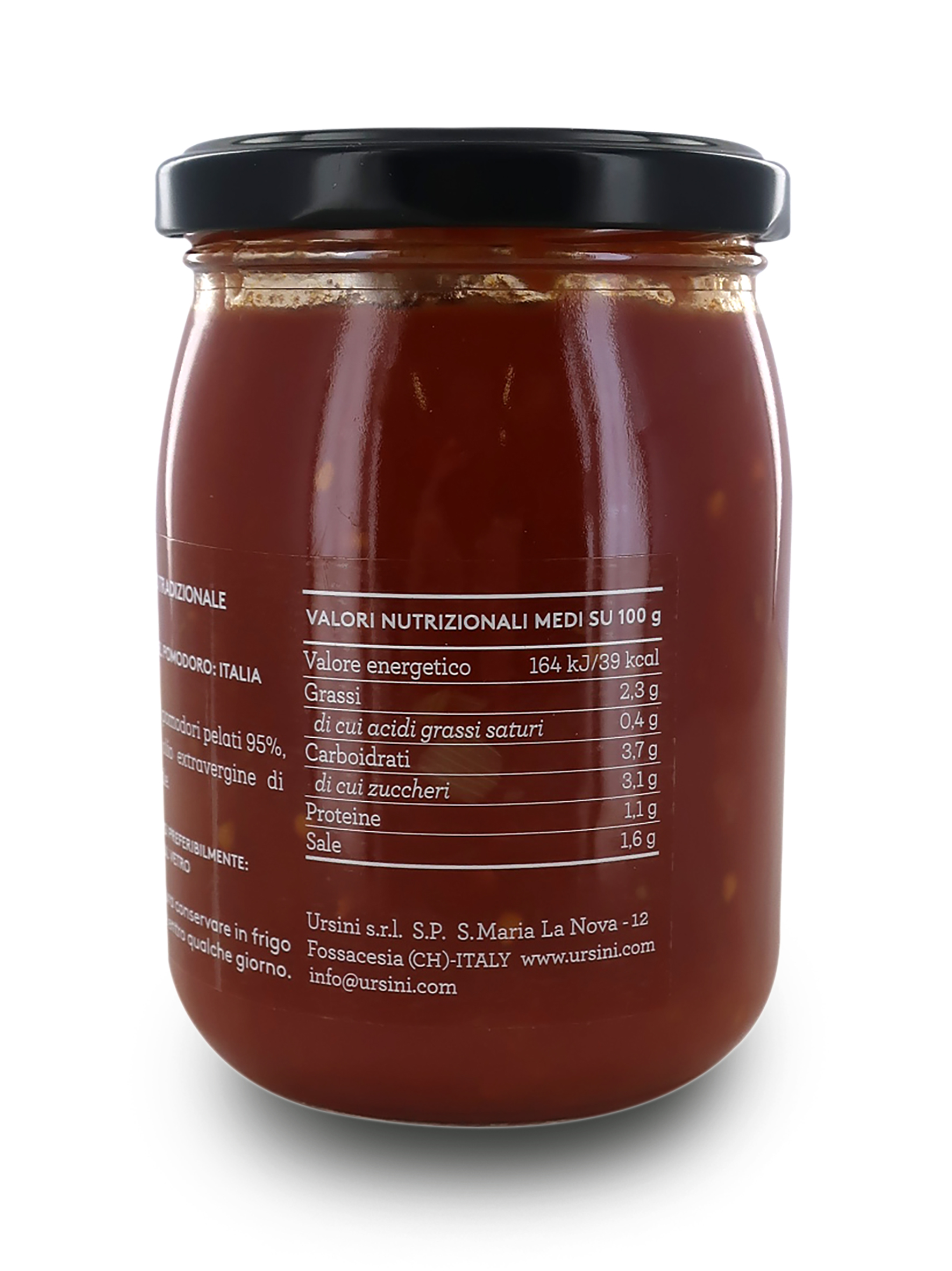 Ingredienti: pomodori pelati 95%, cipolla 2%, olio extravergine di oliva 1%, sale.