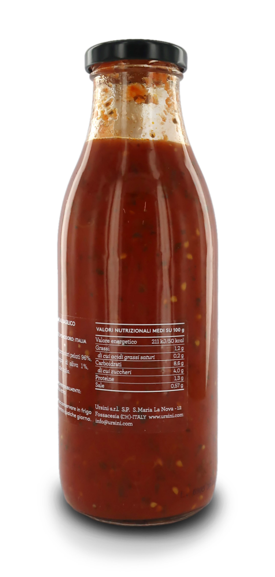 Ingredienti: pomodori pelati 96%, olio extravergine di oliva 1%, basilico 1%, sale, aglio.