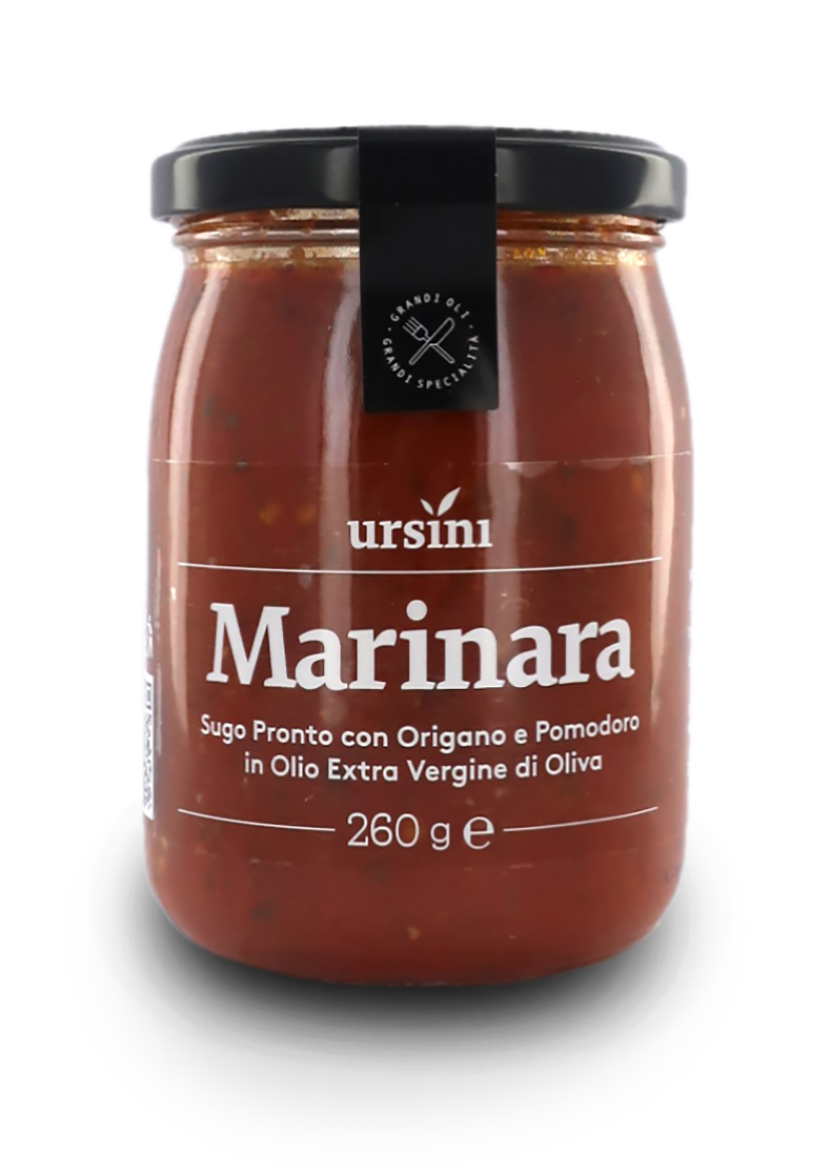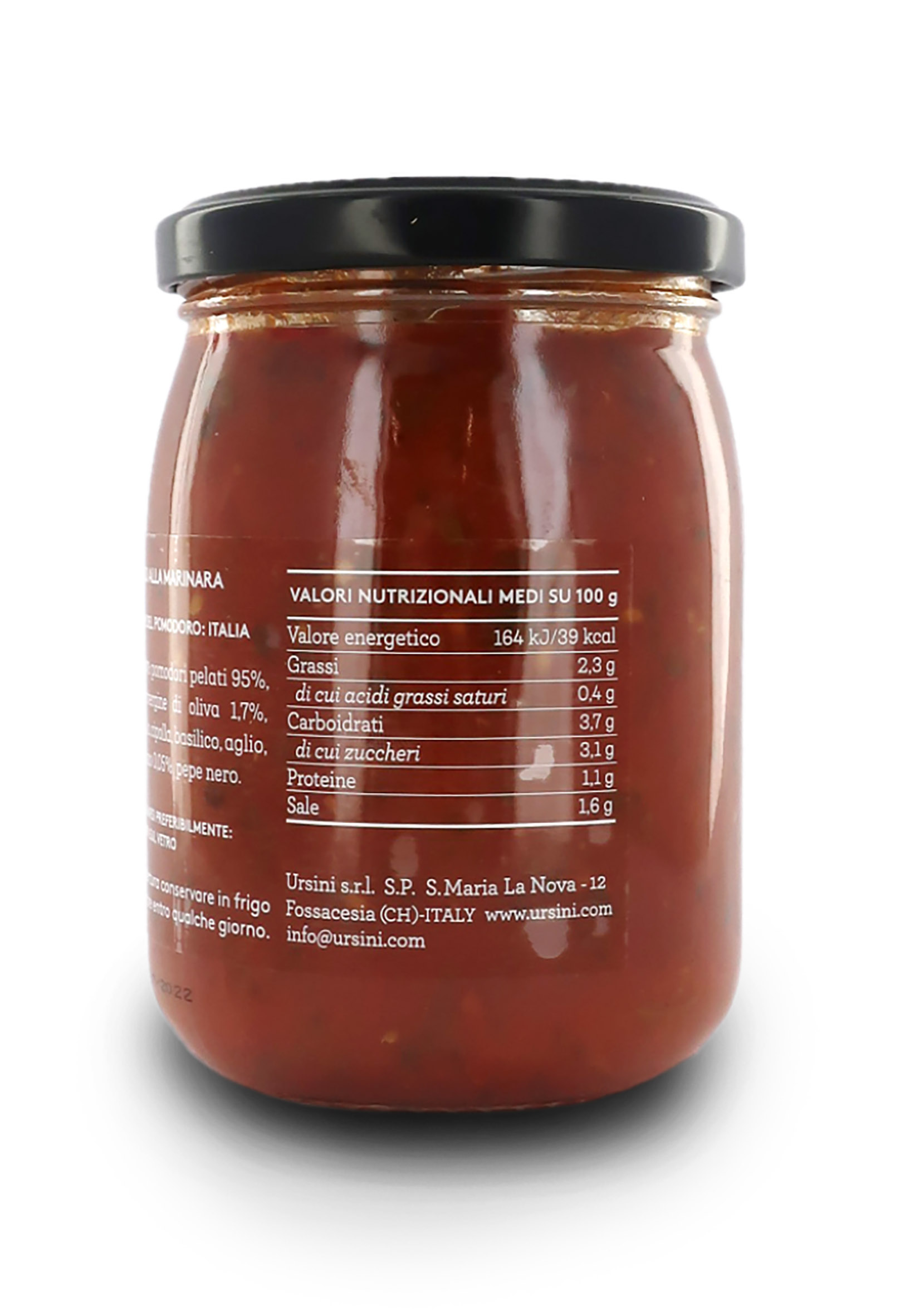 Sugo al gusto classico "marinara", pronto da scaldare e da consumare. Contiene pomodoro, origano e olio extravergine di oliva, ed è insaporito con prezzemolo, cipolla, basilico, aglio e pepe. La semplicità e la genuinità del gusto del pomodoro sono protagoniste in questo sugo, condimento tra i più classici della tradizione culinaria italiana.