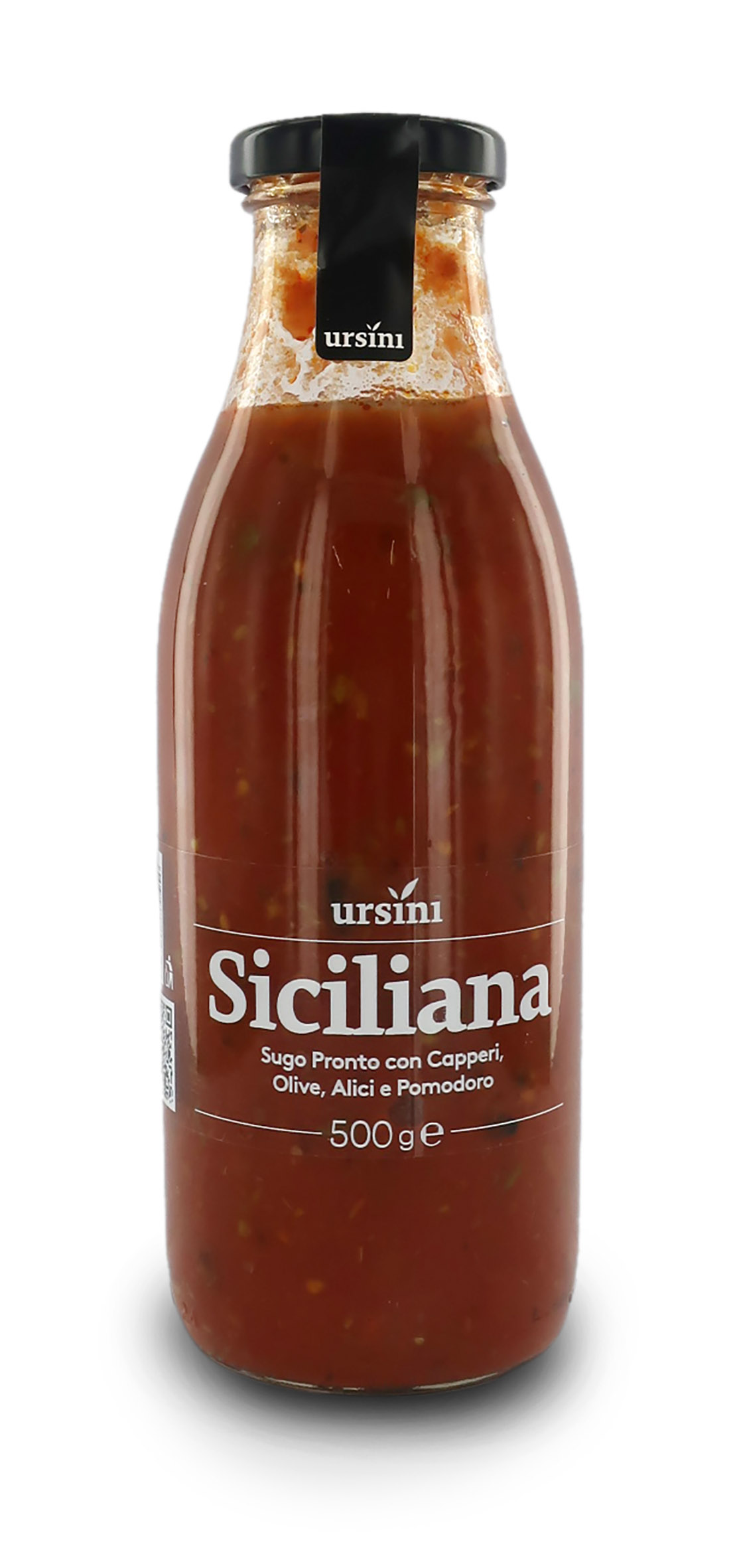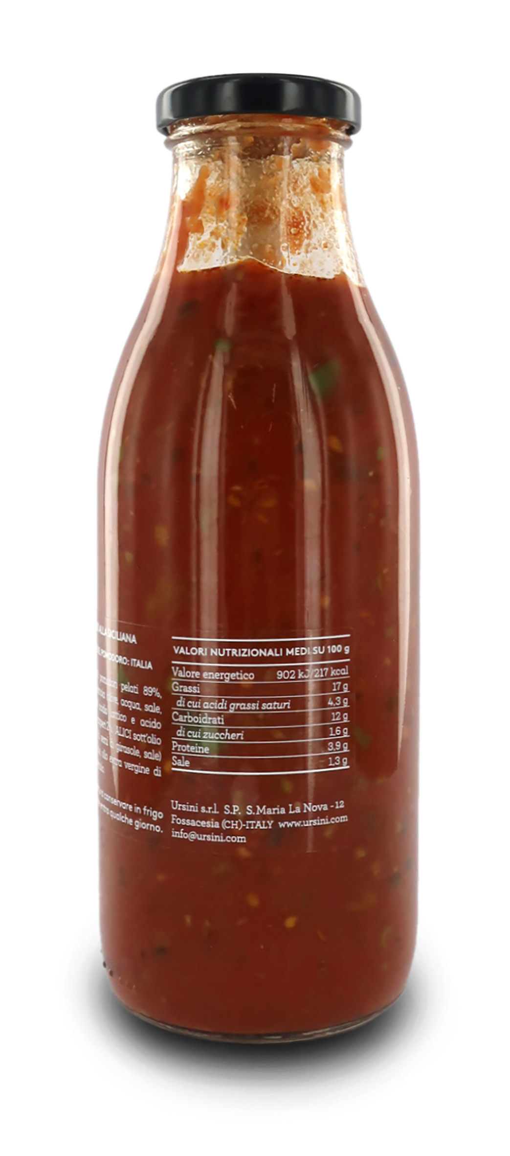 Sugo di pomodoro con acciughe e capperi, conosciuto anche come "alla siciliana". Pronto da scaldare (2/3 minuti) e da consumare. Contiene pomodoro pelato italiano e olio extravergine di oliva, ed è insaporito con alici, olive, capperi, aglio, sale e prezzemolo. Il gusto del pomodoro e la grande sapidità delle alici e dei capperi sono protagonisti in questo sugo, condimento classico tra i più amati della tradizione culinaria italiana.