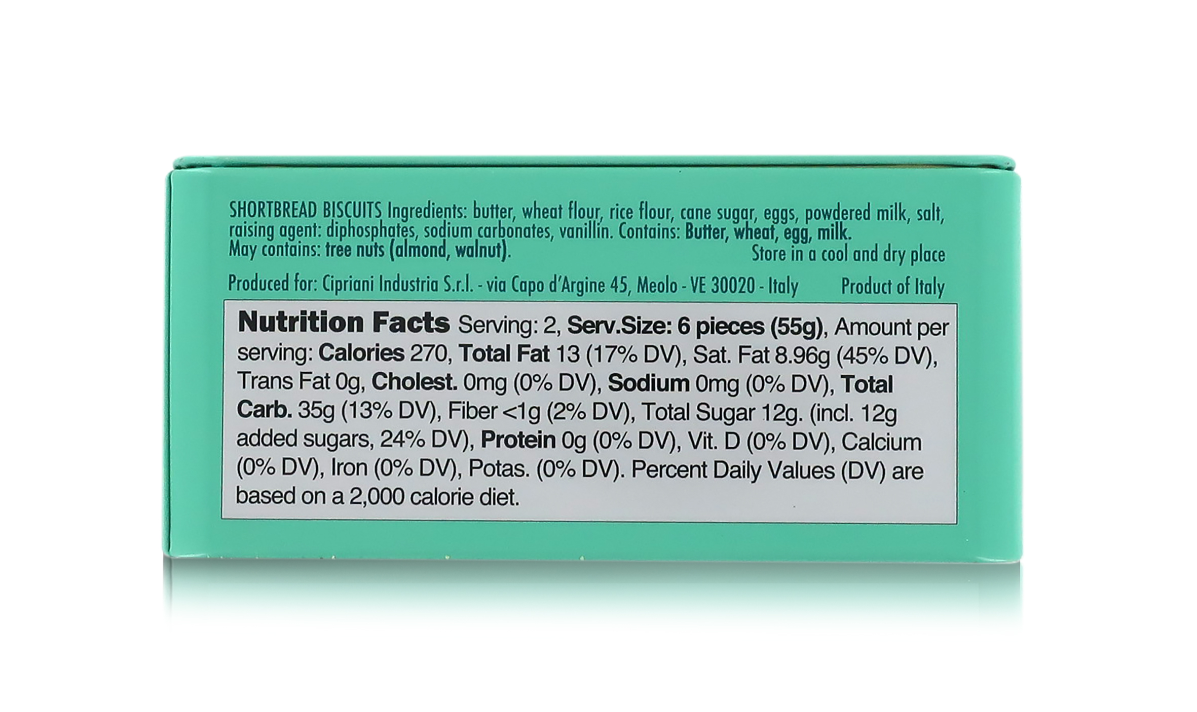 I biscotti frollini Cipriani sono contenuti in una bellissima scatolina di latta rettangolare, nei colori iconici del brand Cipriani. La scatola, una volta terminati i biscotti, può essere comodamente utilizzata come piccolo contenitore.