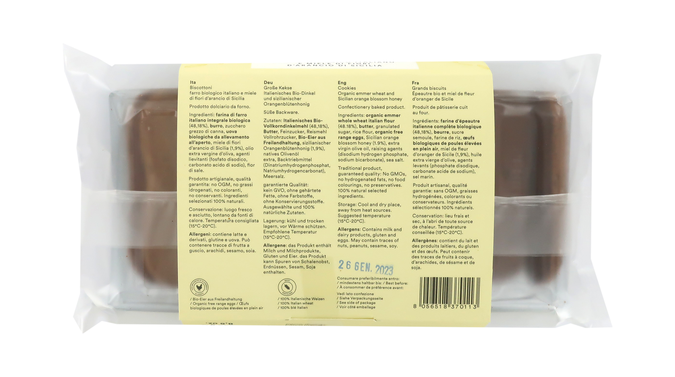 Biscottone n. 4 con farro biologico italiano e miele di fiori d'arancio di Sicilia. Perfetta unione tra le proprietà nutritive del farro e la naturale dolcezza del miele siciliano.