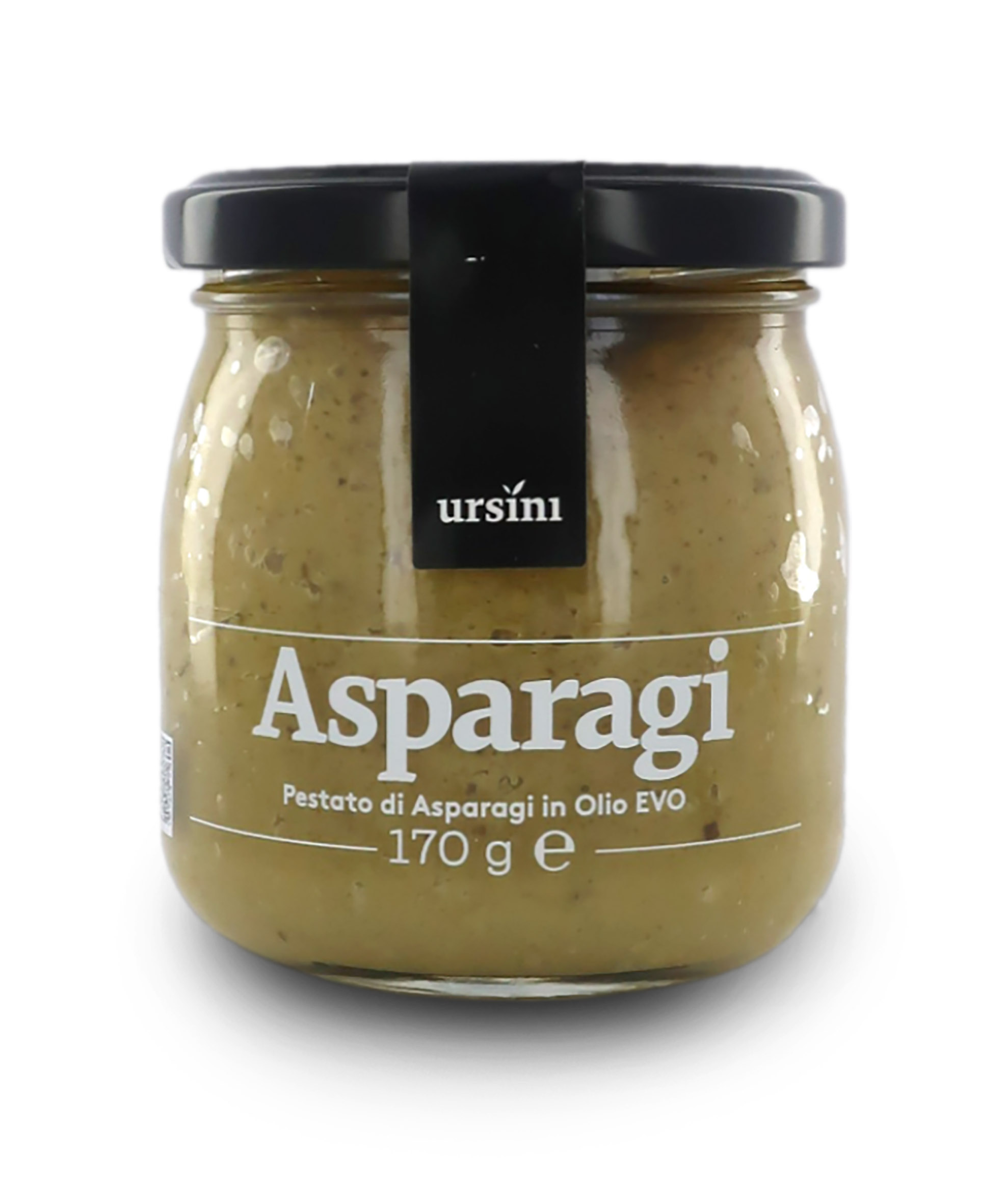 Pestato di asparagi in olio extravergine d'oliva. Questa preparazione, realizzata con una base di asparagi di vari colori finemente sminuzzati, è piacevolmente insaporita da ingredienti fortemente aromatici e dal gusto deciso, come alici e varie spezie. In vasetto da 170g. Ottimo da spalmare su tartine o bruschette, renderà la vostra farcitura per panini gourmet ancora più saporita. Indicato anche come condimento per ravvivare una pasta in bianco o dei risotti.