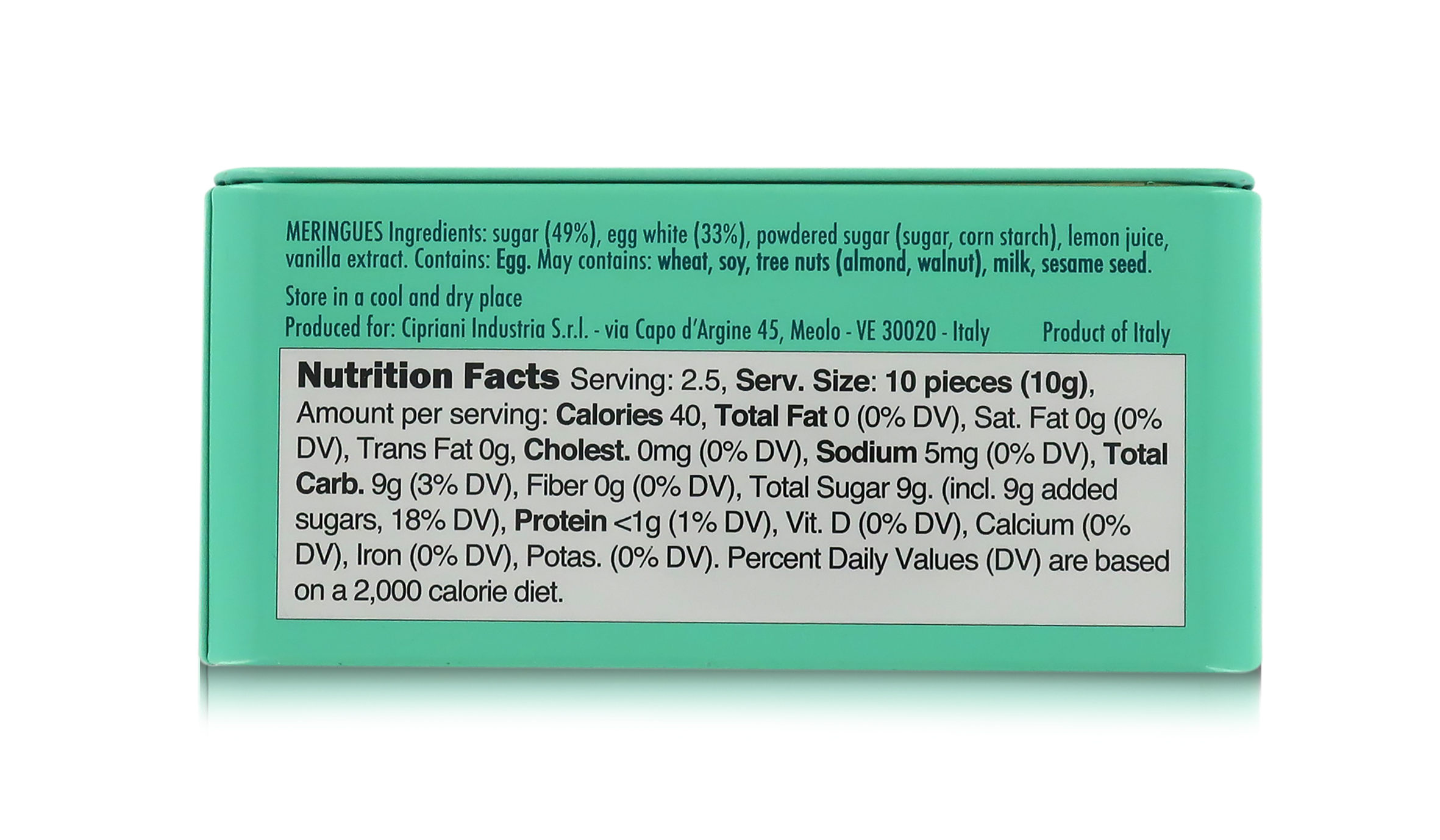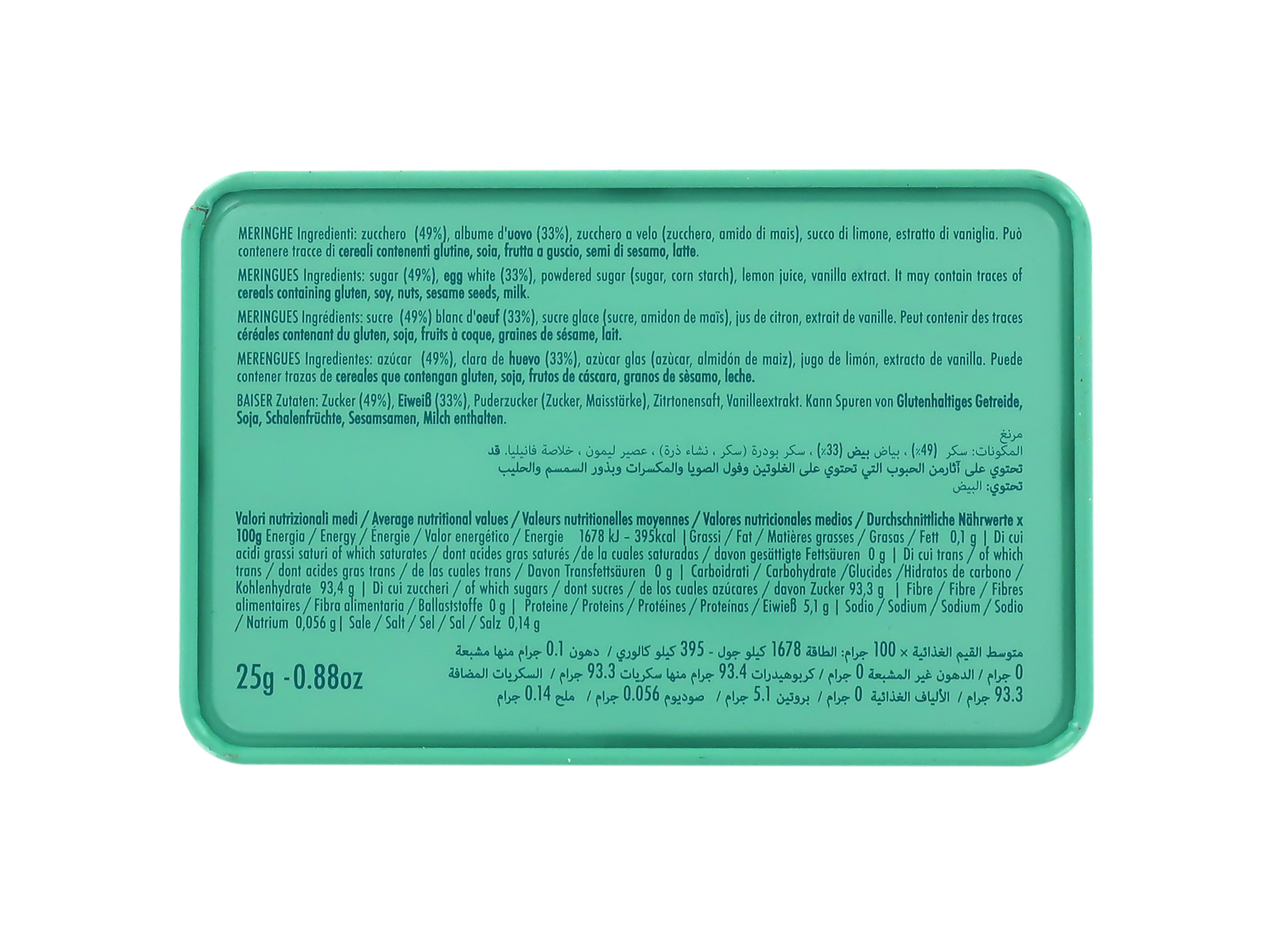 Ruvide, fragranti e friabili, dalla forma irregolare, si sciolgono in bocca, lasciando note dolci e amabili. Perfette da accompagnare al gelato e al caffè. Realizzate a mano, mediante un processo artigianale in cui albumi e zucchero vengono montati a neve. La cottura lenta a temperatura controllata permette di ottenere meringhe leggerissime e delicate, che si sciolgono in bocca.